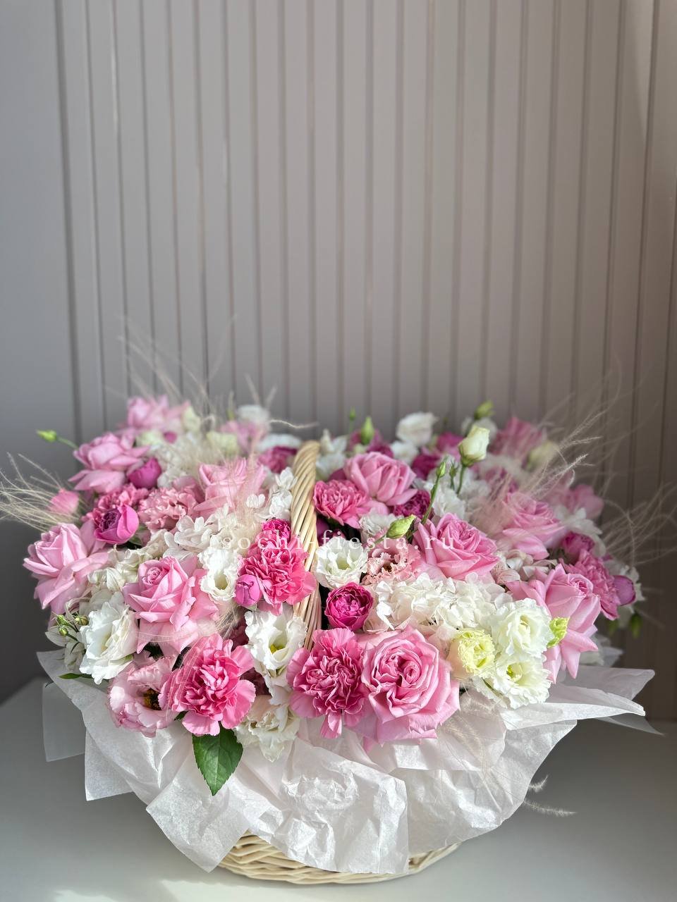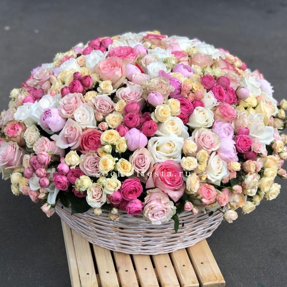 Масштабная корзина объединяет лилии, гортензии, антиринум, розы и эустому в единую объёмную композицию. Высота и насыщенность каждого слоя создают впечатление цветочного изобилия.