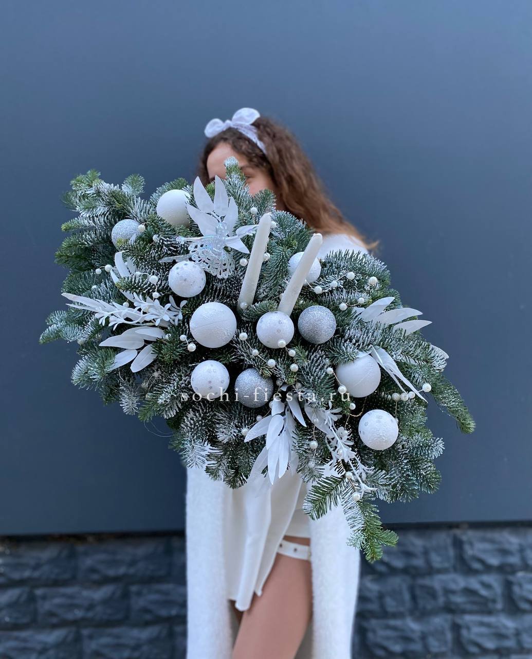 Низкая композиция с нобилисом и свечами создаёт камерное настроение вечера. Балерина добавляет лёгкости среди плотной хвои и блестящих игрушек.
