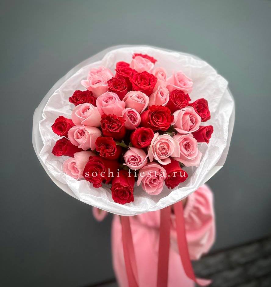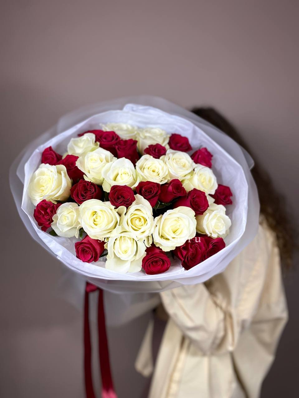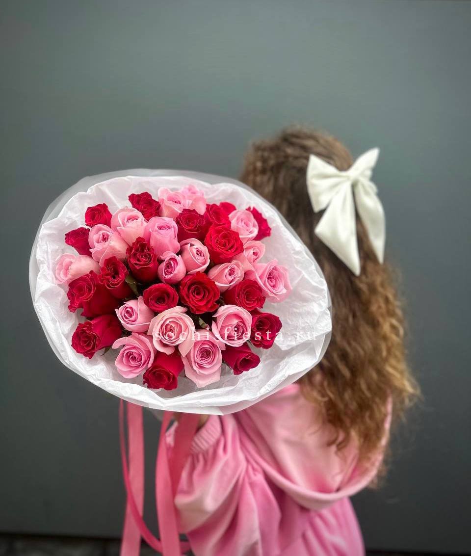 Длинные стебли и крупные бутоны в палитре микс создают букет с графичным силуэтом. Сто одна роза выстраивается в плотную композицию с выразительной вертикалью.
