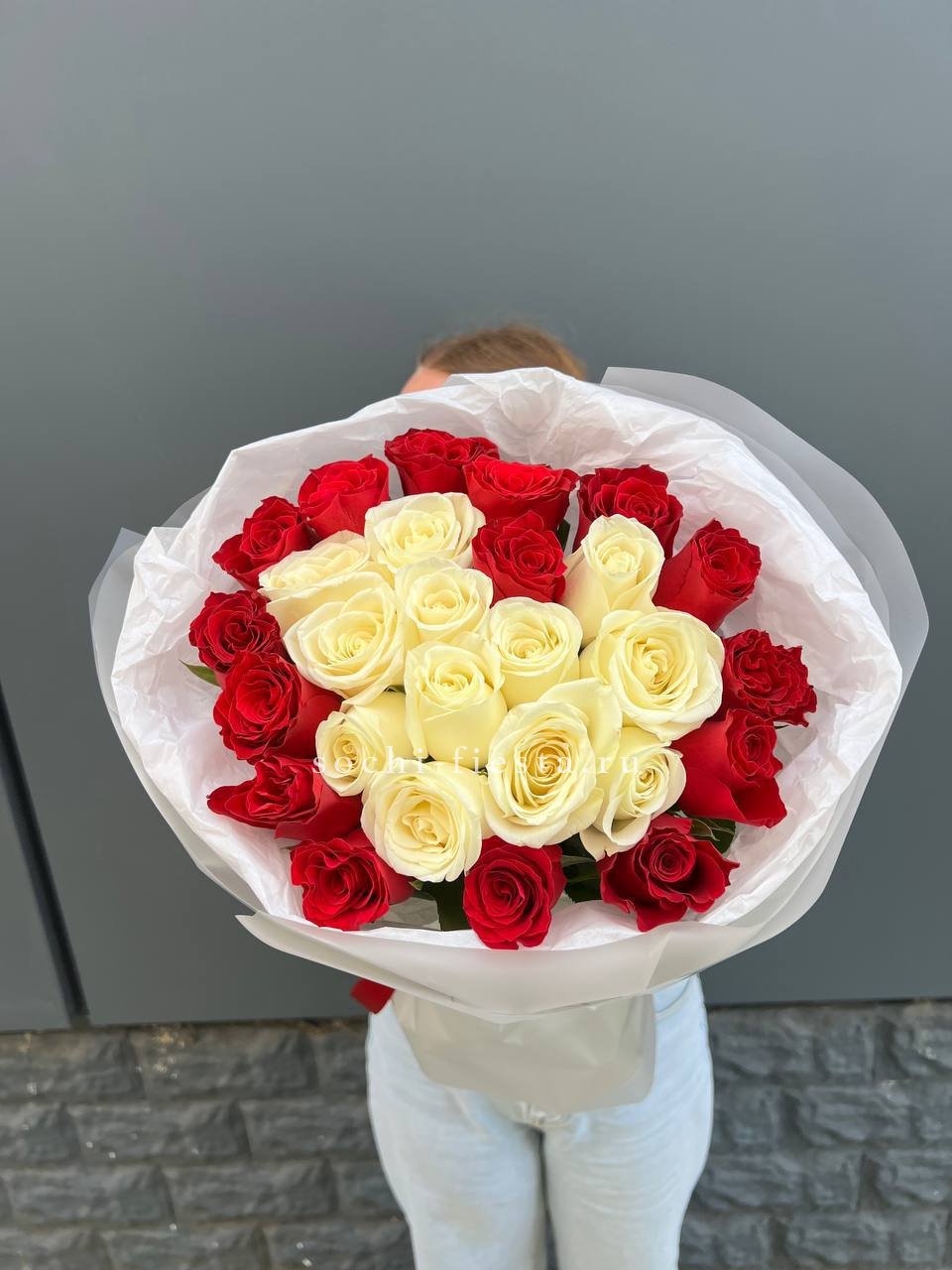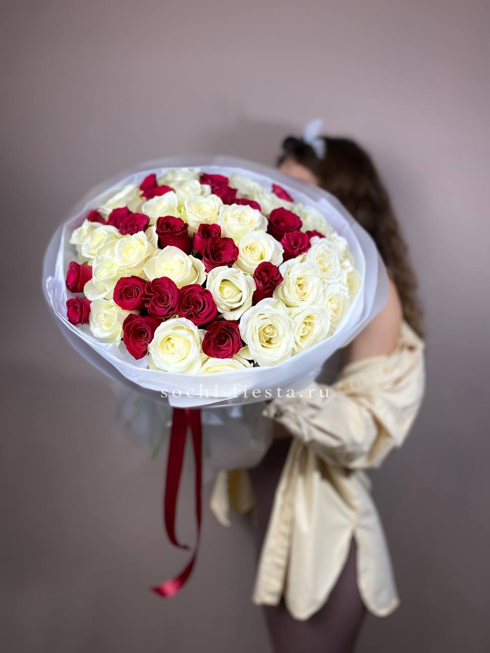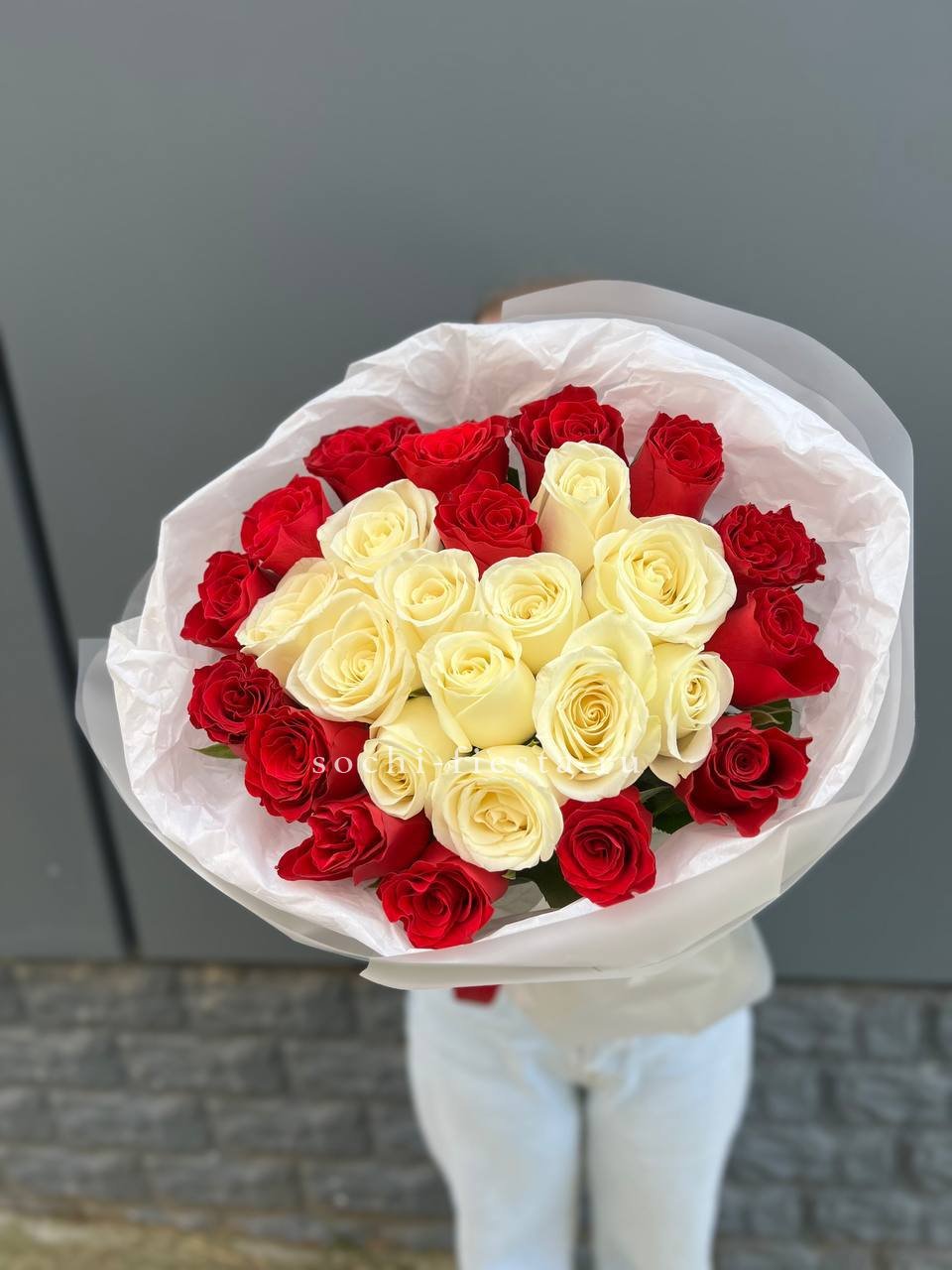 В составе 45 красно-белых роз.