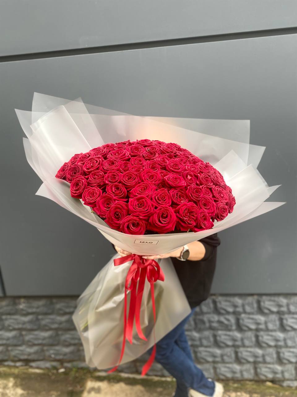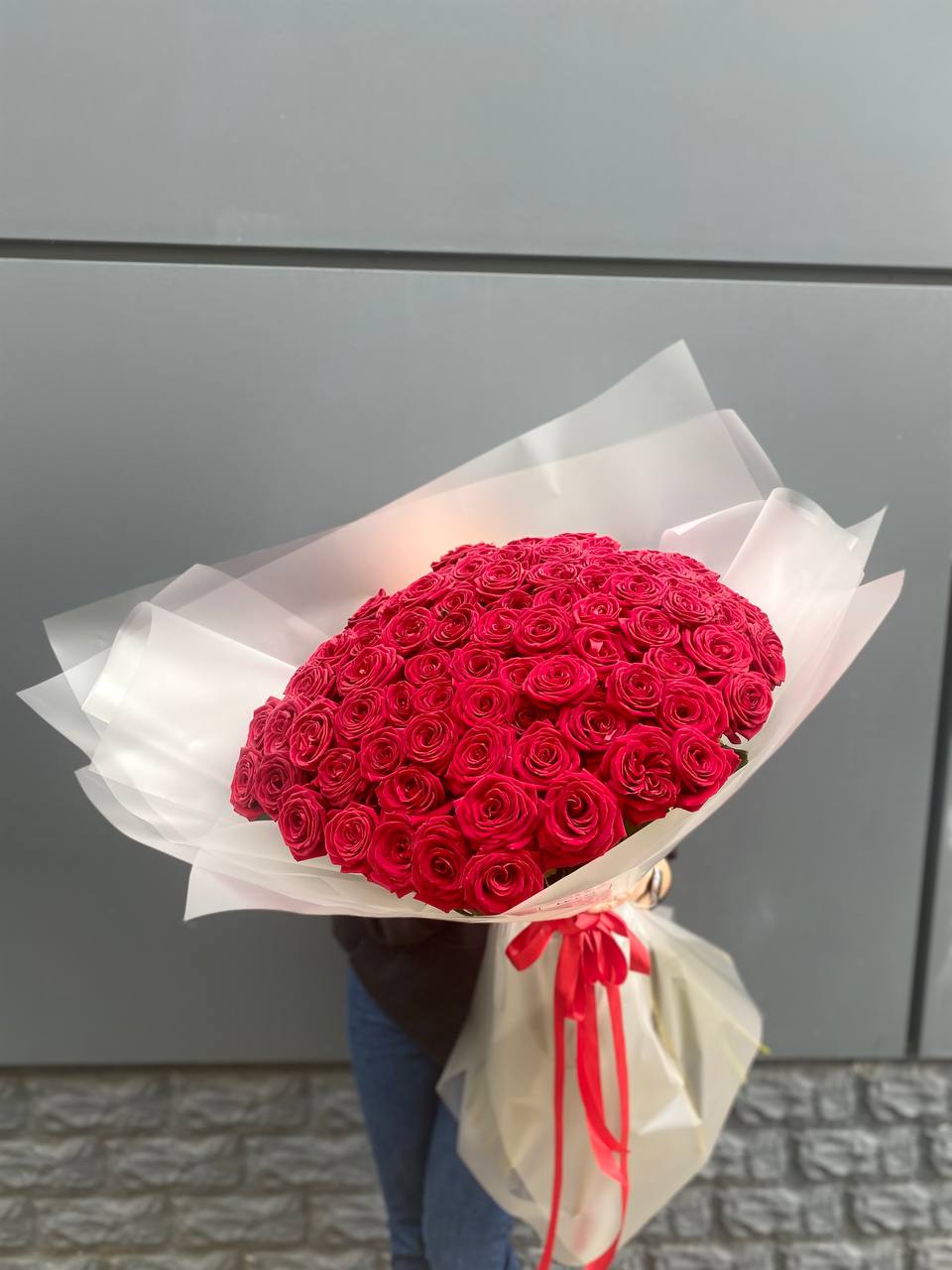 101 роза (60 красных, 41 белая), лента.