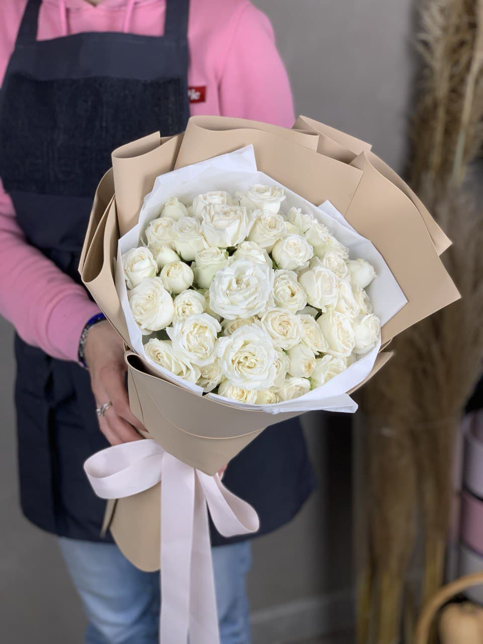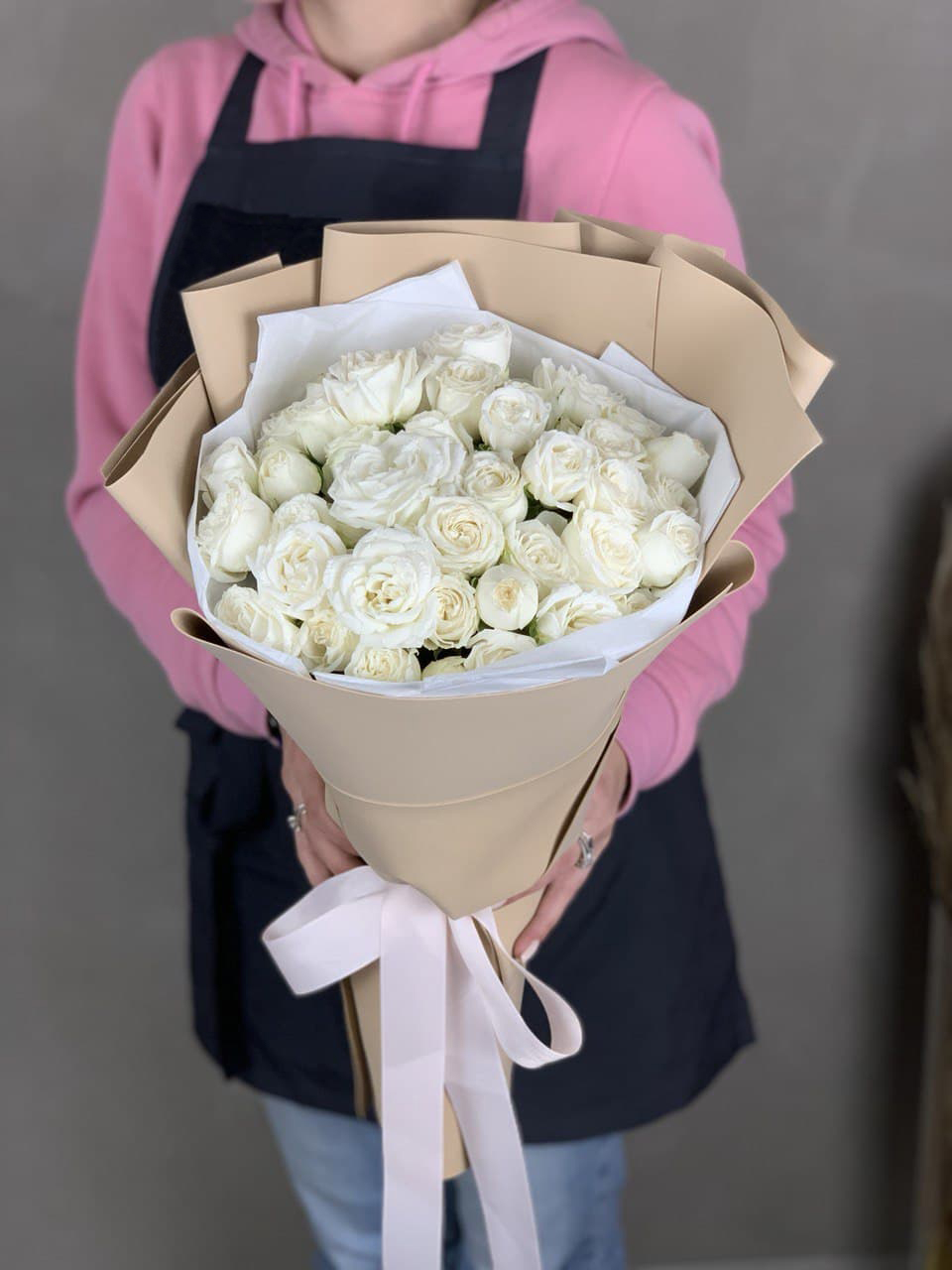 Плотная охапка кремовых роз с мягким переходом оттенков от сливочного до топленого молока. Бутоны собраны без зазоров, образуя округлую форму с естественным объемом. Атласная лента фиксирует стебли и завершает композицию.