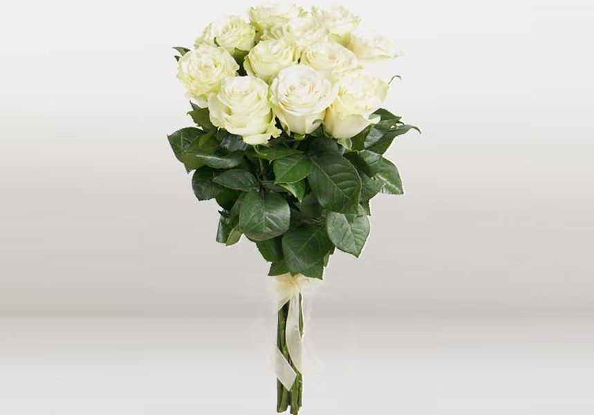 Пятнадцать белых роз собраны в плотный букет с чистыми линиями. Прозрачная упаковка сохраняет свежесть и открывает естественную красоту бутонов.