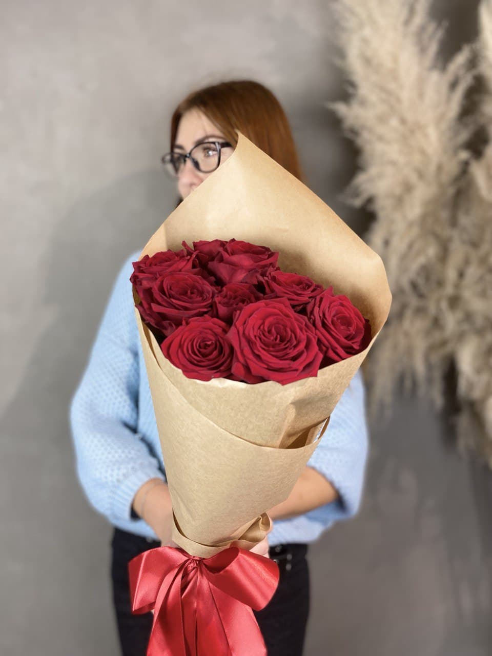 9 красных роз в крафте