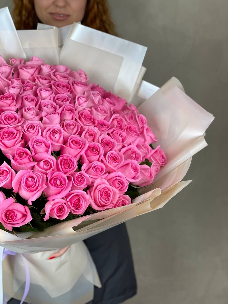 Сто одна роза выстраивается в масштабную композицию, которая заполняет пространство цветом и объемом. Белая упаковка обрамляет букет, создавая ощущение воздуха вокруг плотно собранных бутонов.