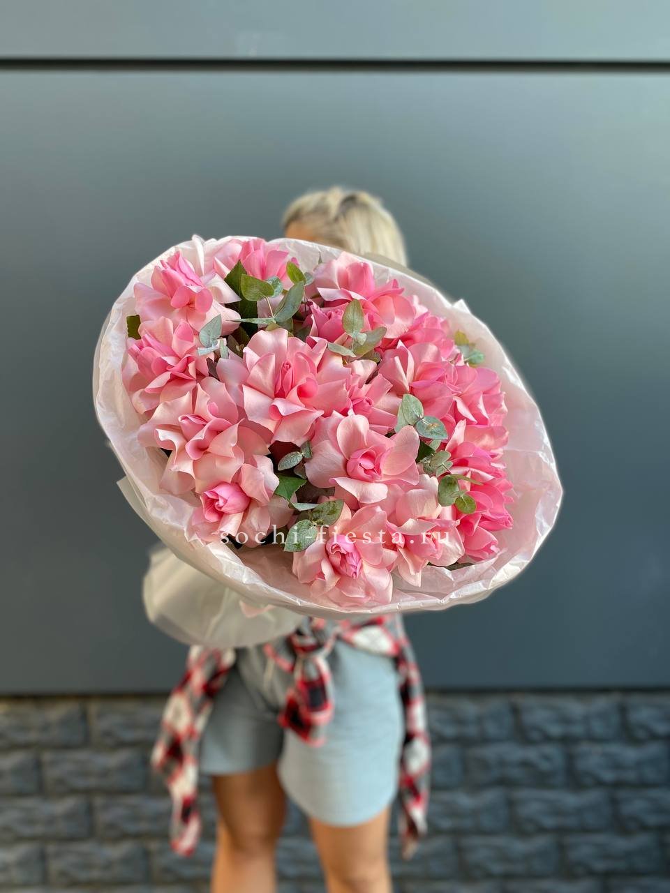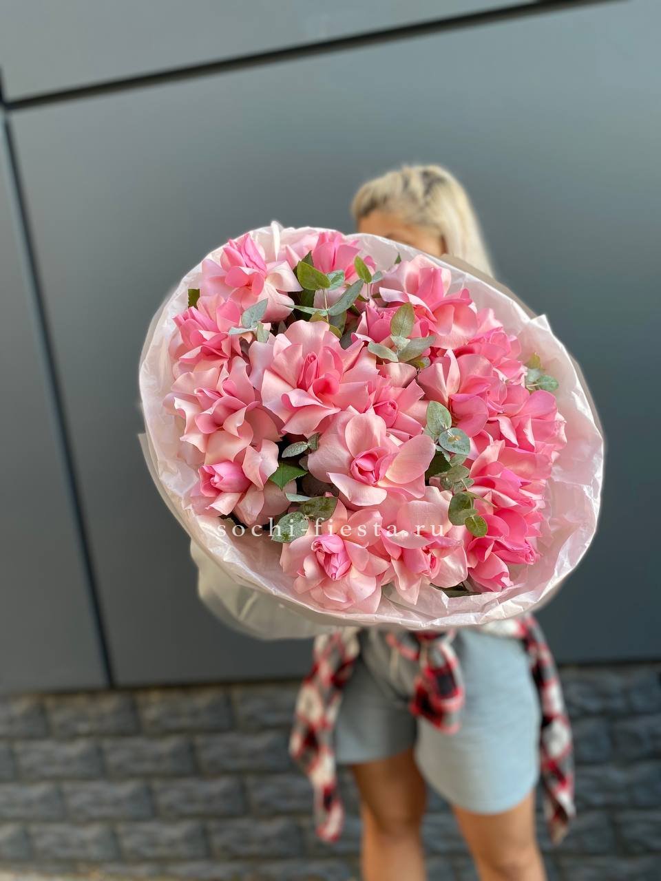 Двадцать пять роз нежно-розового оттенка собраны в аккуратный букет с продуманной упаковкой. Бутоны держат форму долго и радуют свежестью.