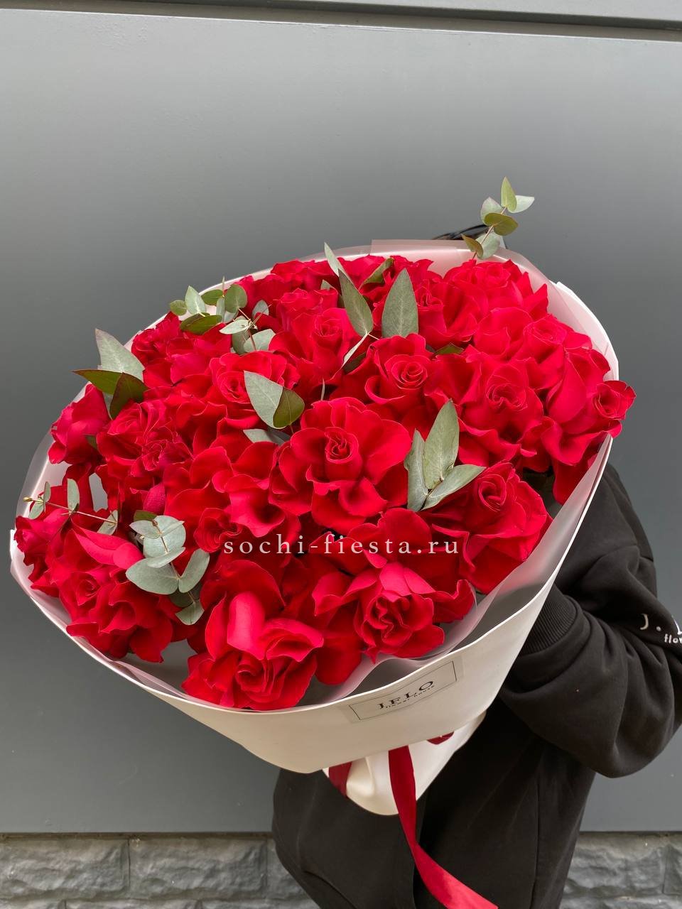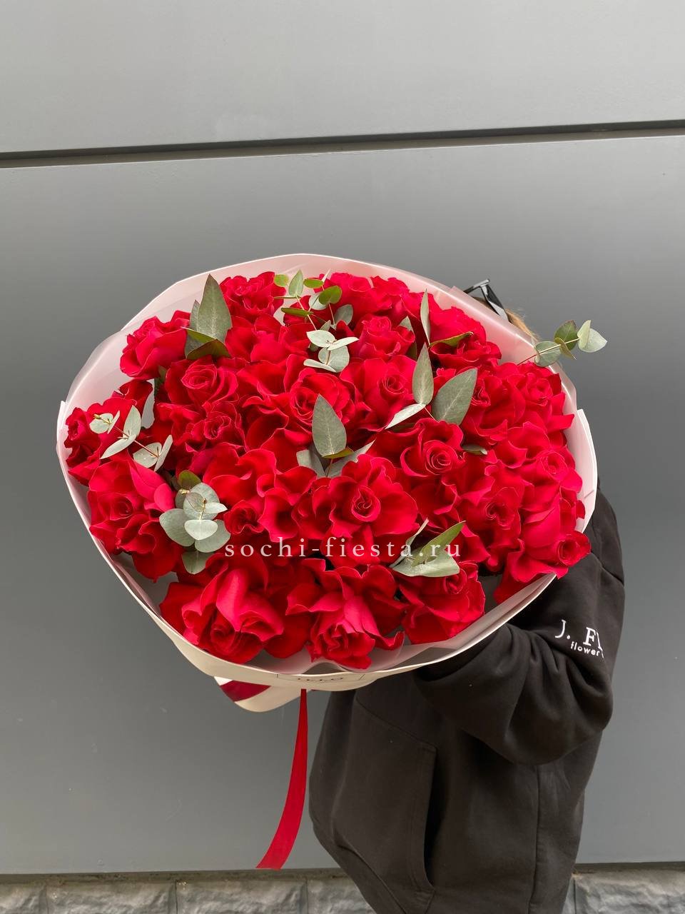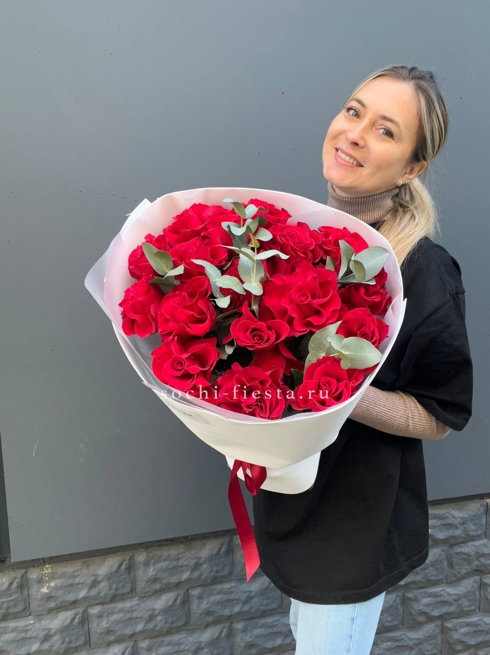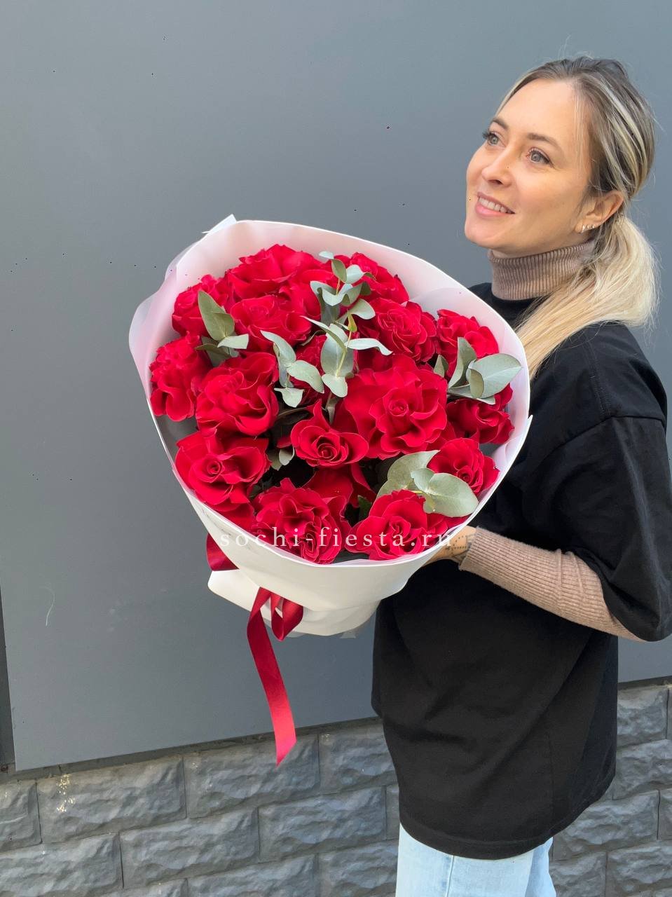 Семь вывернутых роз образуют компактную группу с чистым силуэтом. Ветки эвкалипта задают вертикальный ритм и добавляют воздуха между бутонами. Букет держит форму и выглядит собранно.