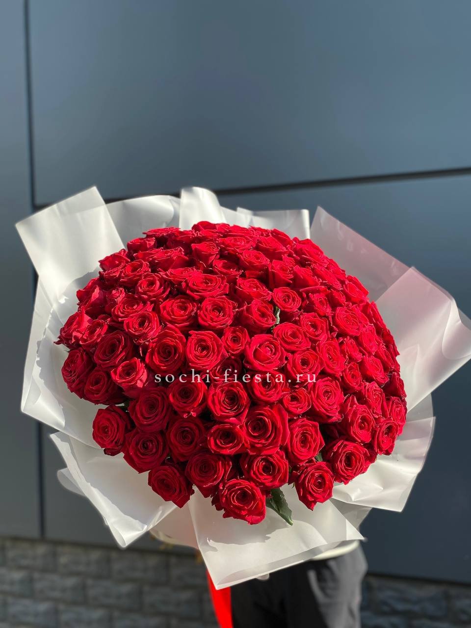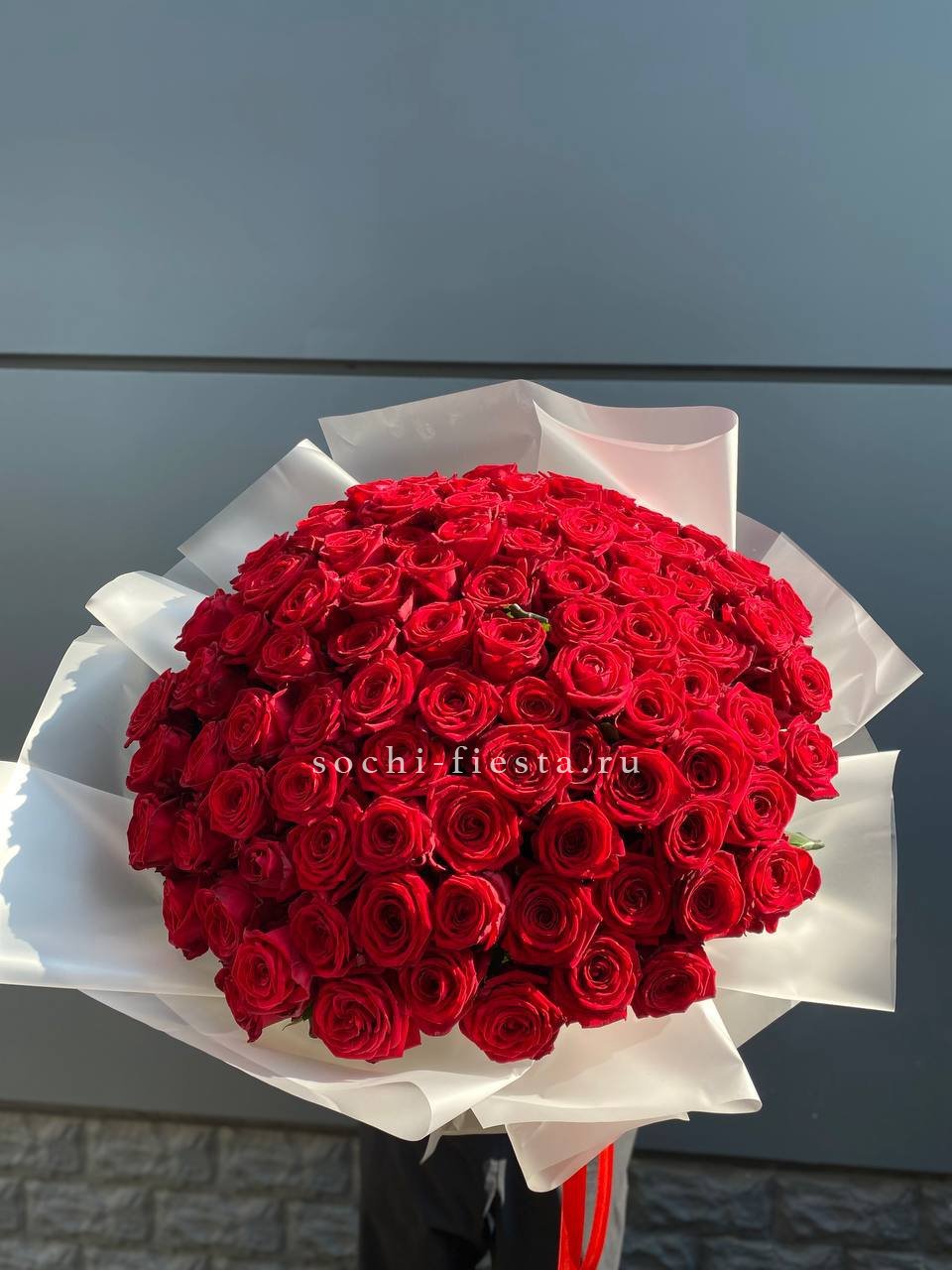 Сто одна красная роза собрана в монохромный букет насыщенного алого оттенка. Высокие стебли создают впечатляющий объем и заполняют пространство уверенным присутствием.