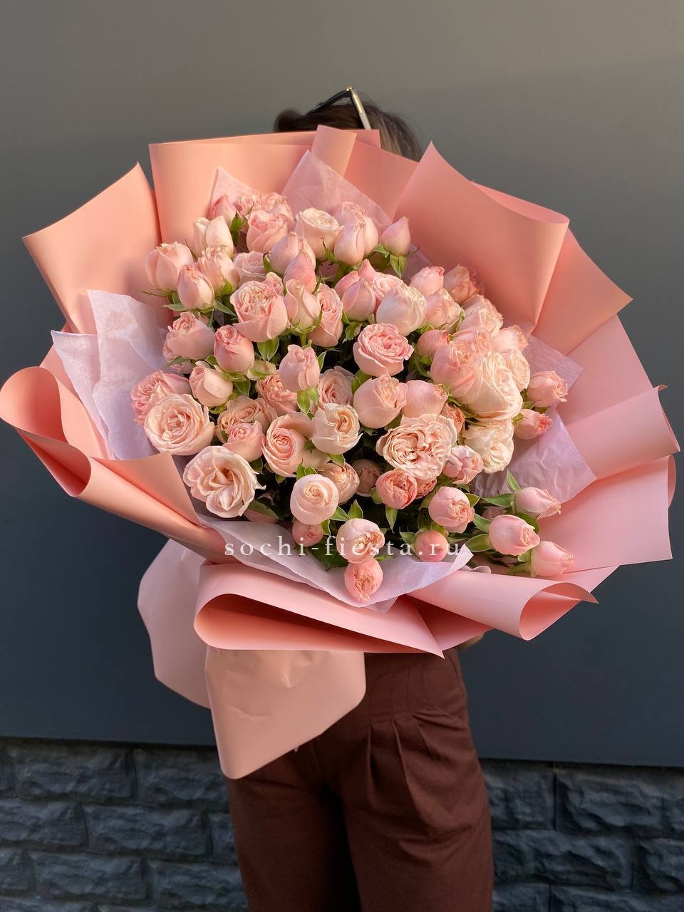 Пятьдесят один белоснежный бутон собран в плотный букет с мягким ритмом раскрытия. Кустовые розы создают воздушный объем и заполняют пространство светом.