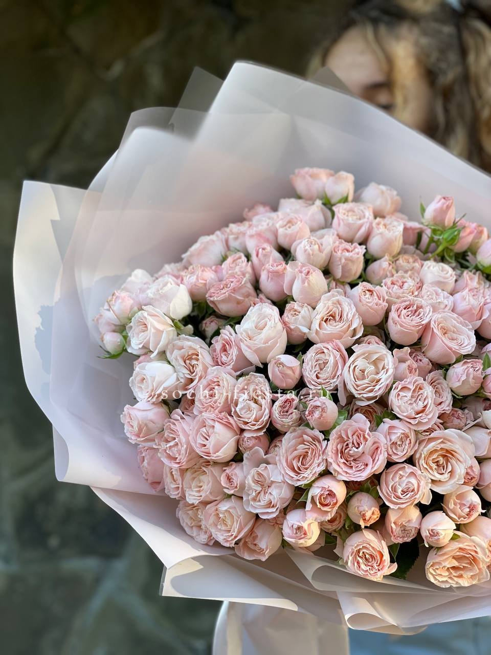 пионовидные розы Бомбастик нежных оттенков, лента, упаковка.