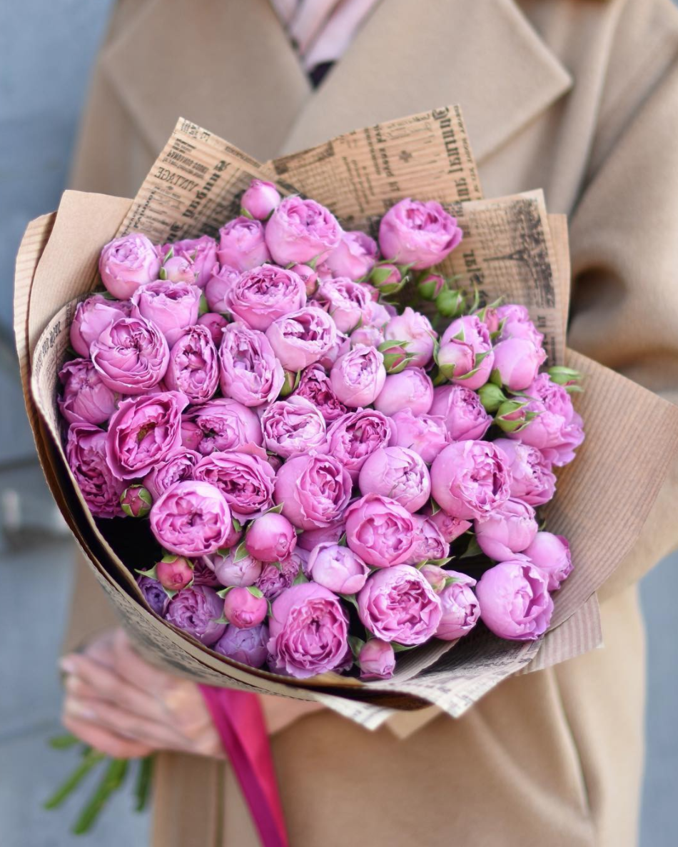 Пышные многолепестковые головки с дымчато-лавандовым оттенком собраны в компактную композицию. Каждый бутон раскрывается слоями, создавая объёмную текстуру и мягкую игру света на лепестках.