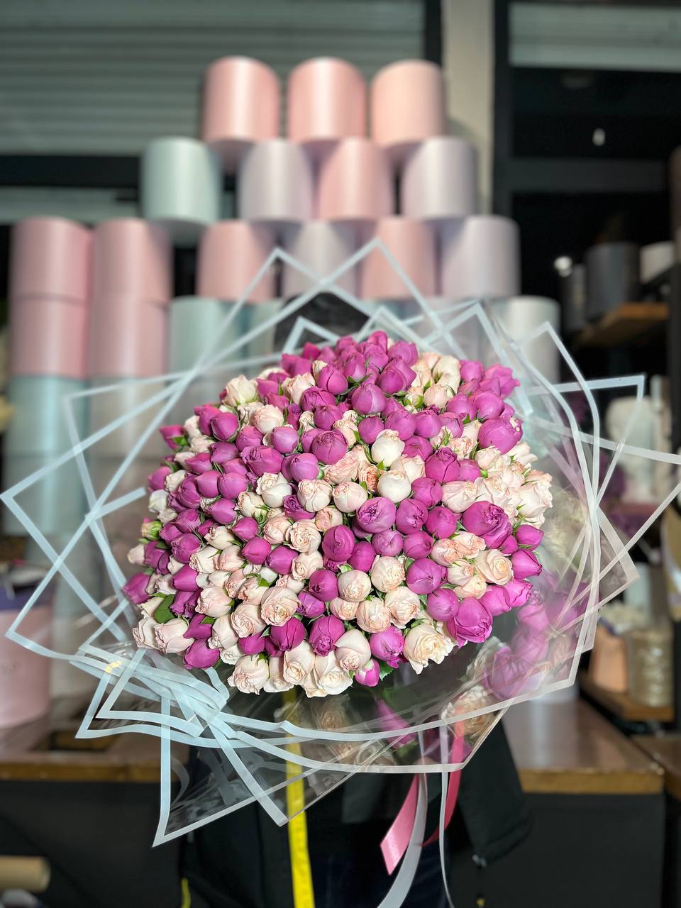 Пятнадцать кустовых роз собраны в плотную округлую форму. Мелкие бутоны создают воздушную текстуру и мягкий объём в пространстве.