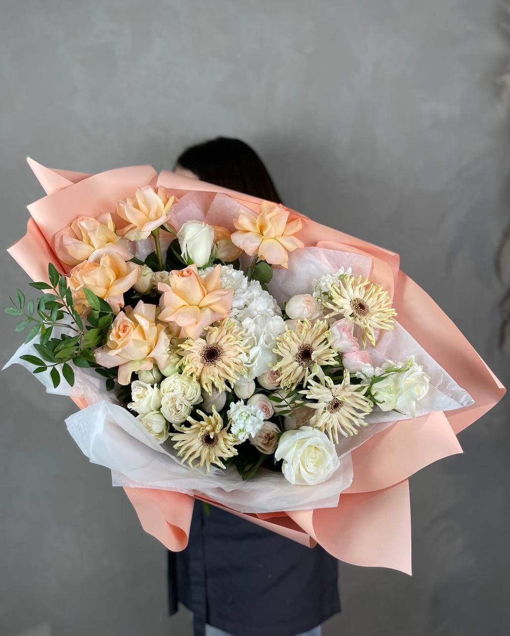 голландские закрученные герберы, эквадорские розы, гортензия, пионовидные кустовые розы, дельфиниум (или аналог), декоративная зелень, лента, дизайнерская упаковка.