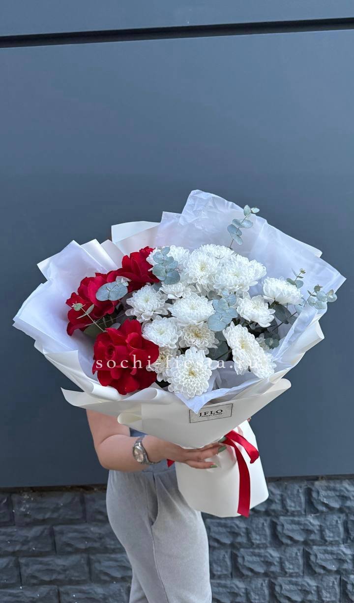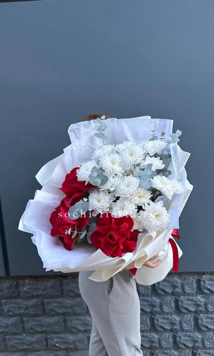 маттиола, розы, гортензия, диантусы, хризантемы , лента и дизайнерская пленка.