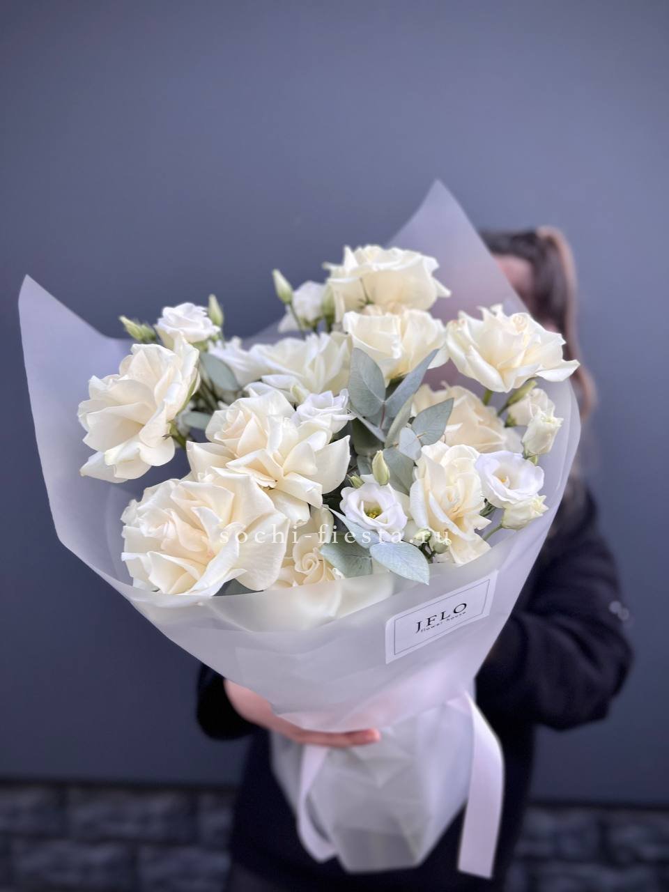 Белые розы и шары гортензии заполняют пространство плотно, но без тяжести. Озатамус вносит лёгкую текстуру, а эвкалипт завершает силуэт спокойной зеленью.