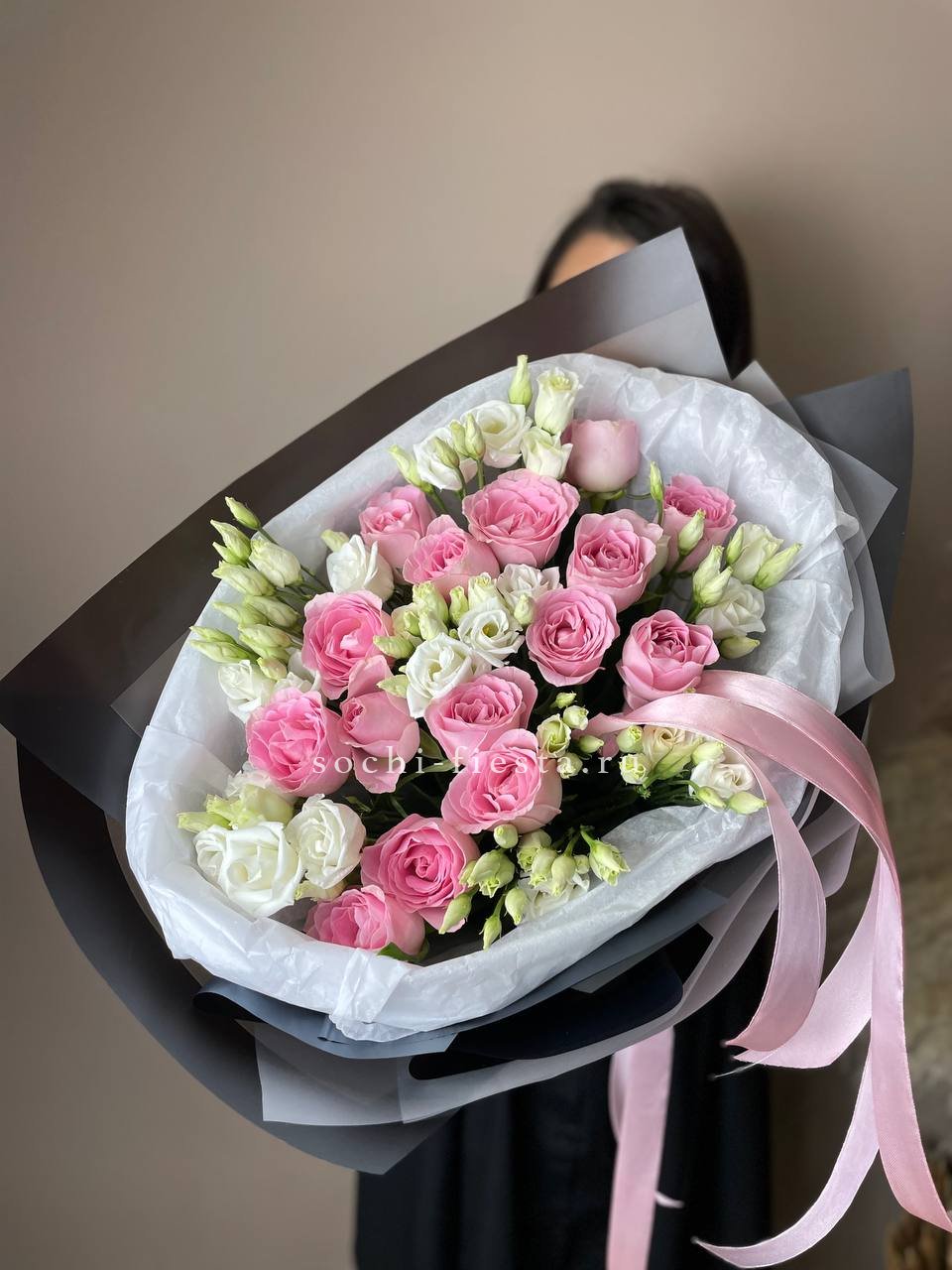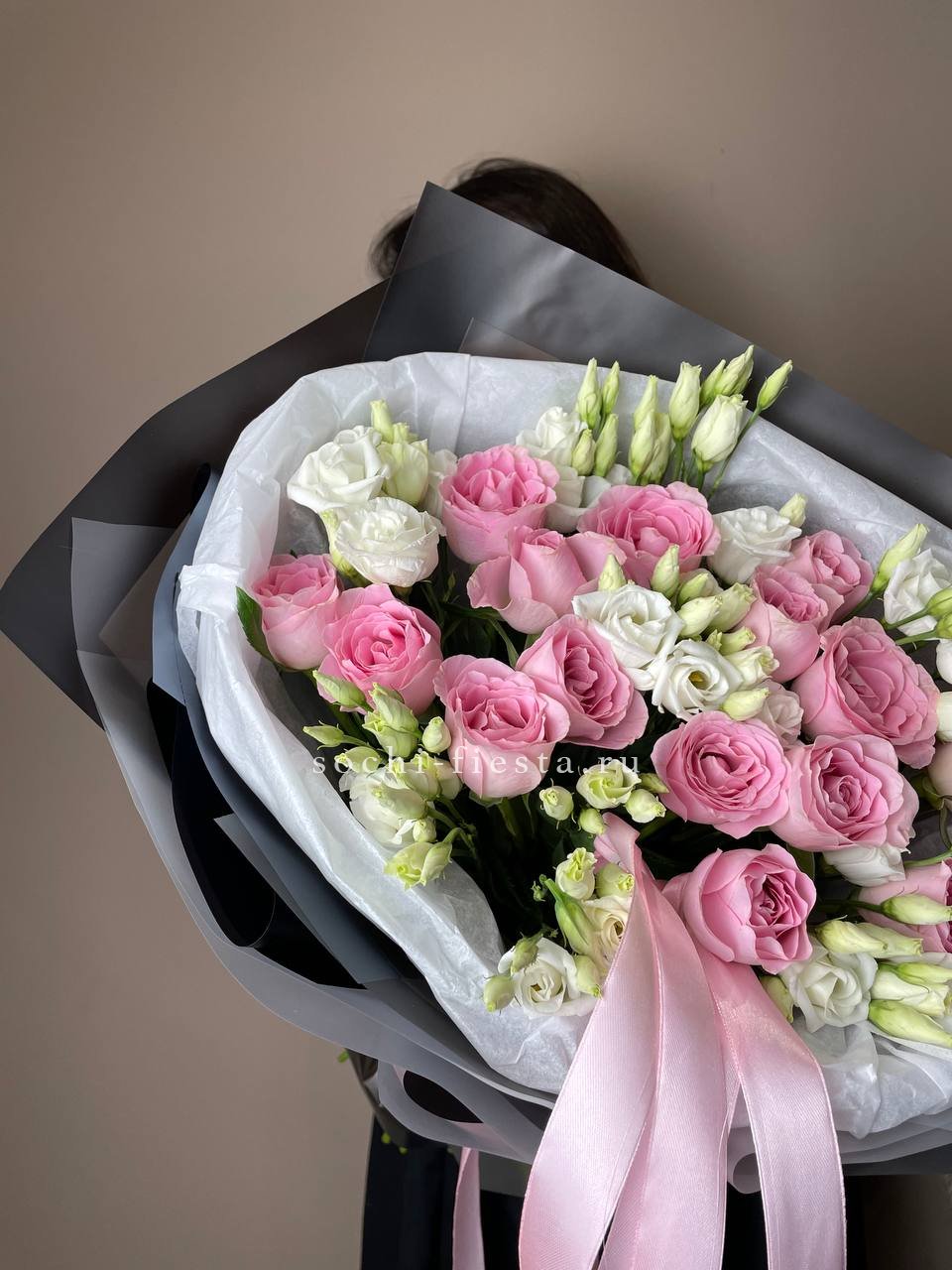 Розовые розы и эустома создают мягкую цветовую волну без резких переходов. Композиция собрана компактно и подходит для пространств с любой стилистикой.