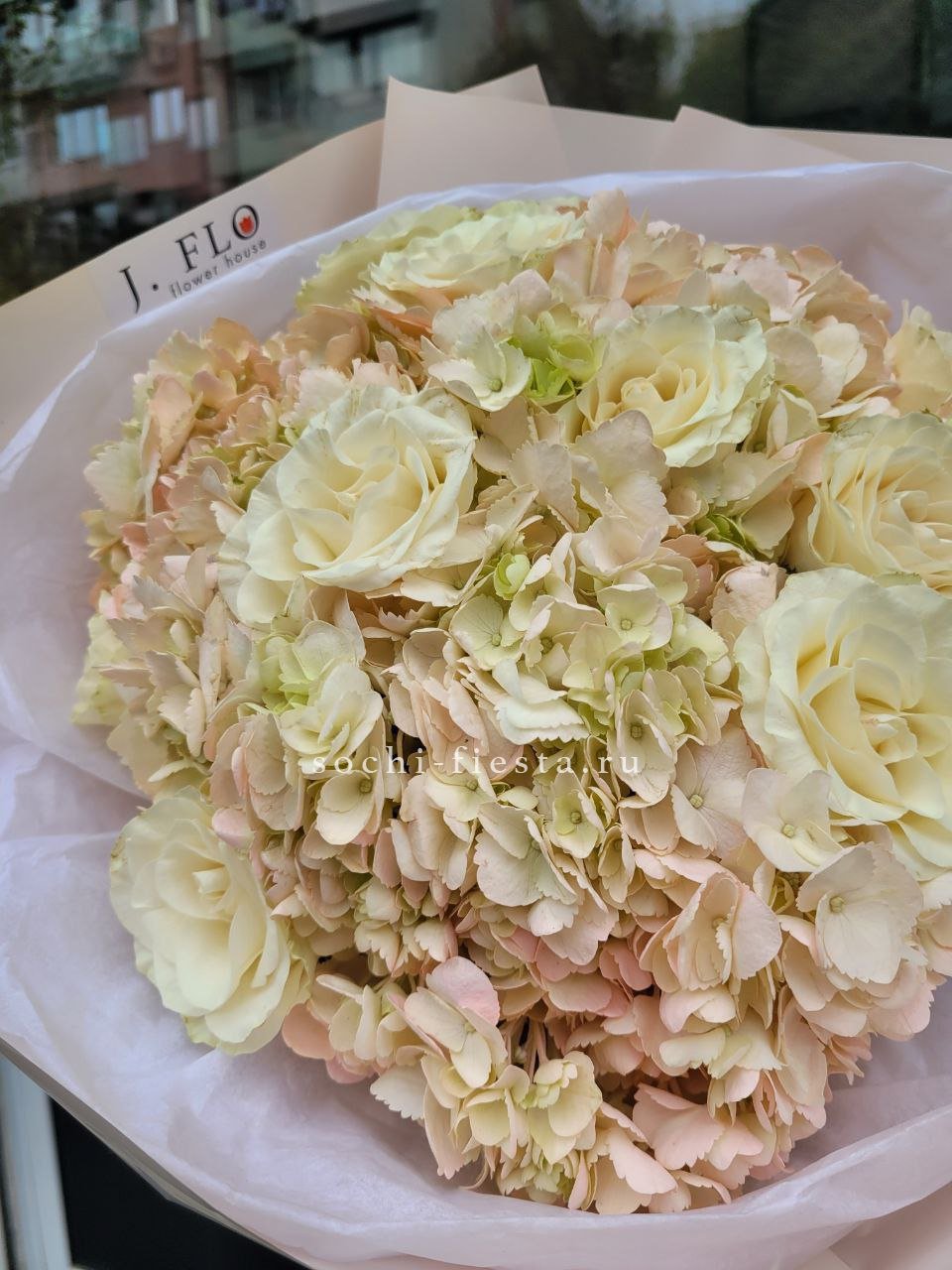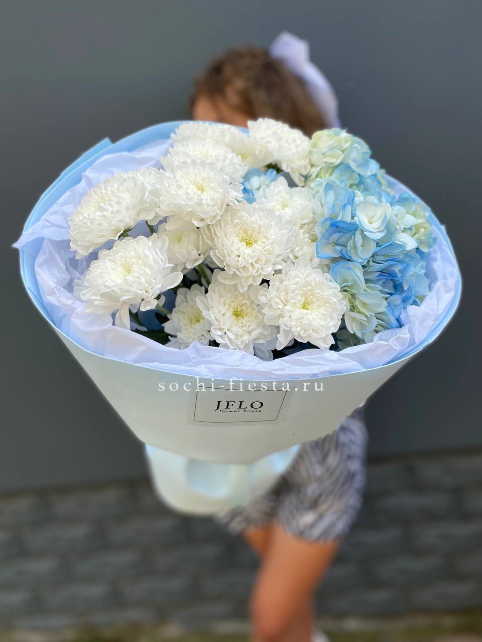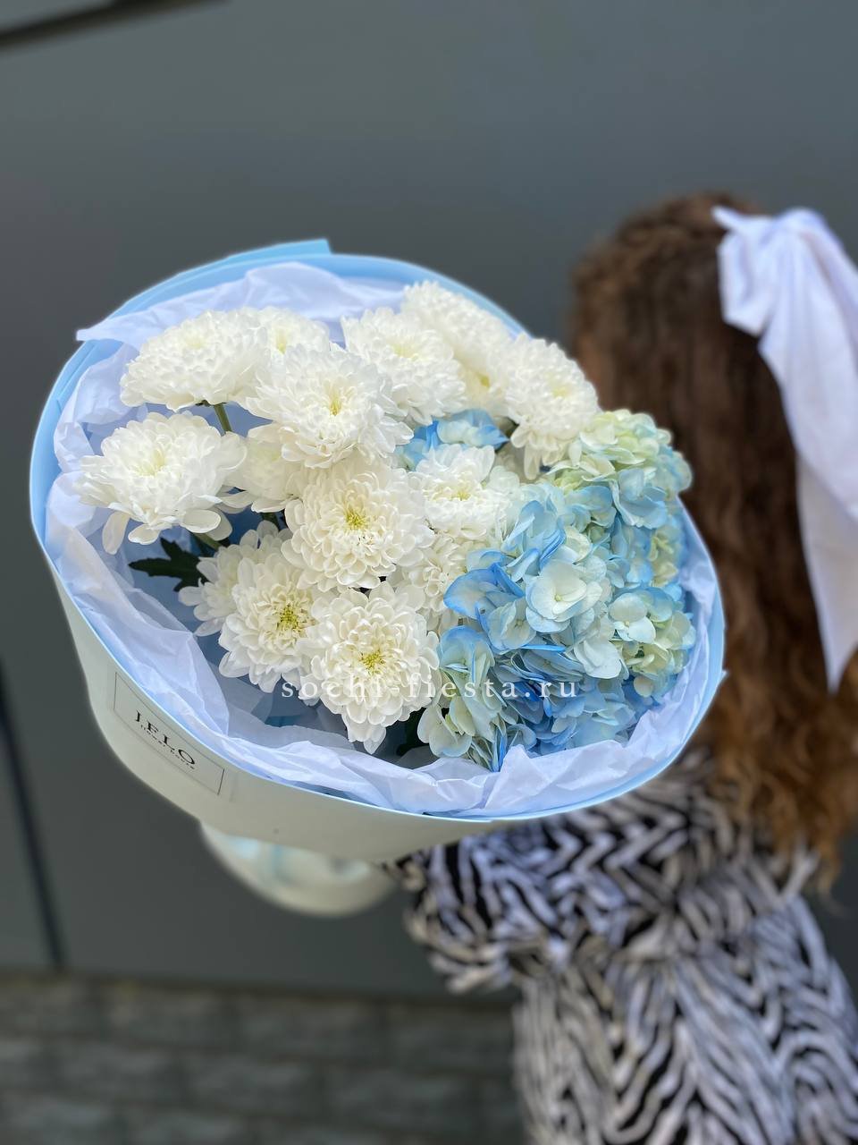Крупные соцветия гортензии задают основной объем, а эустома и диантус разбивают плотность воздушными бутонами. Мисти баблс и озотамус рассыпаются между цветами, добавляя движение и легкость всей композиции.