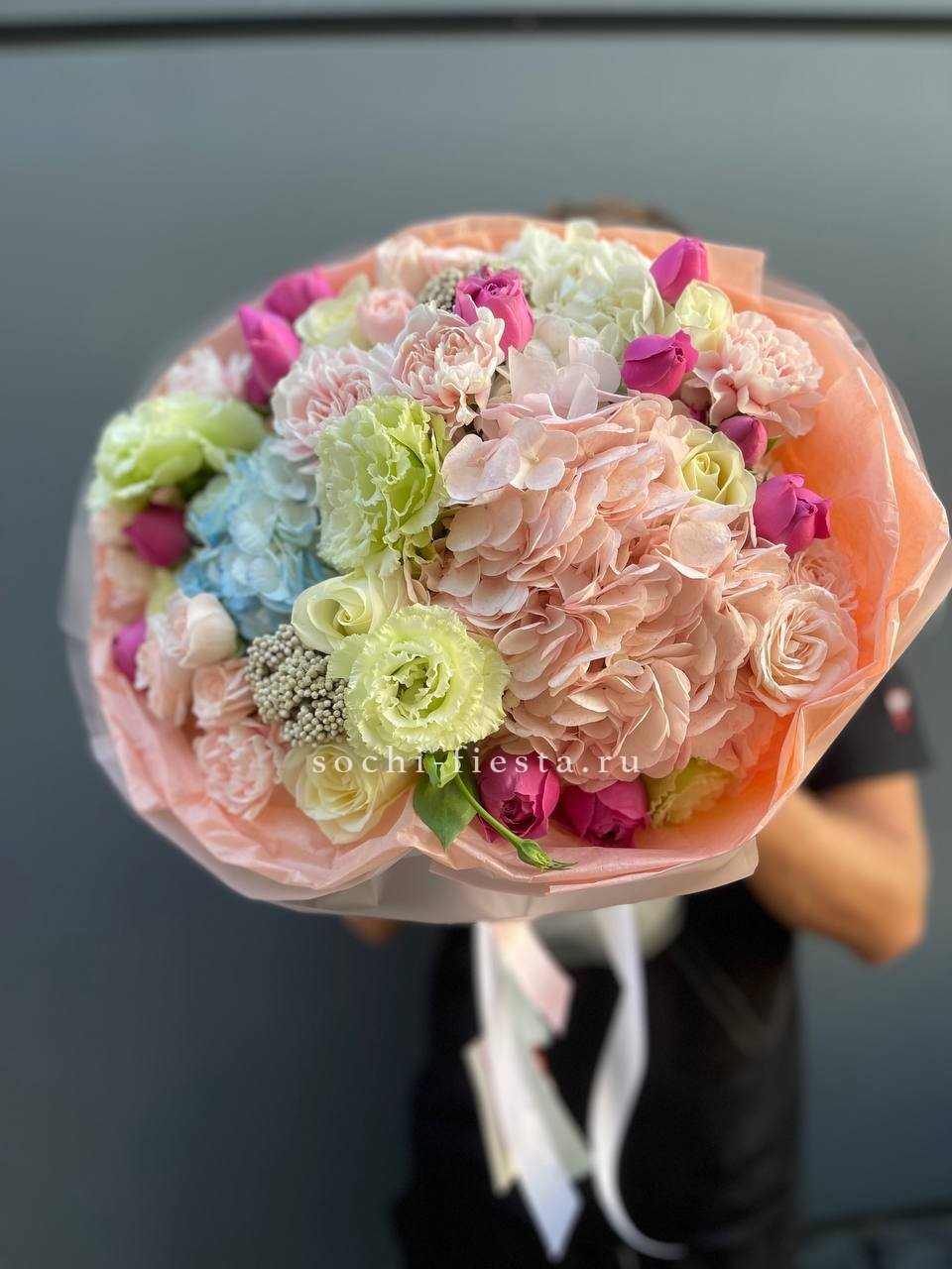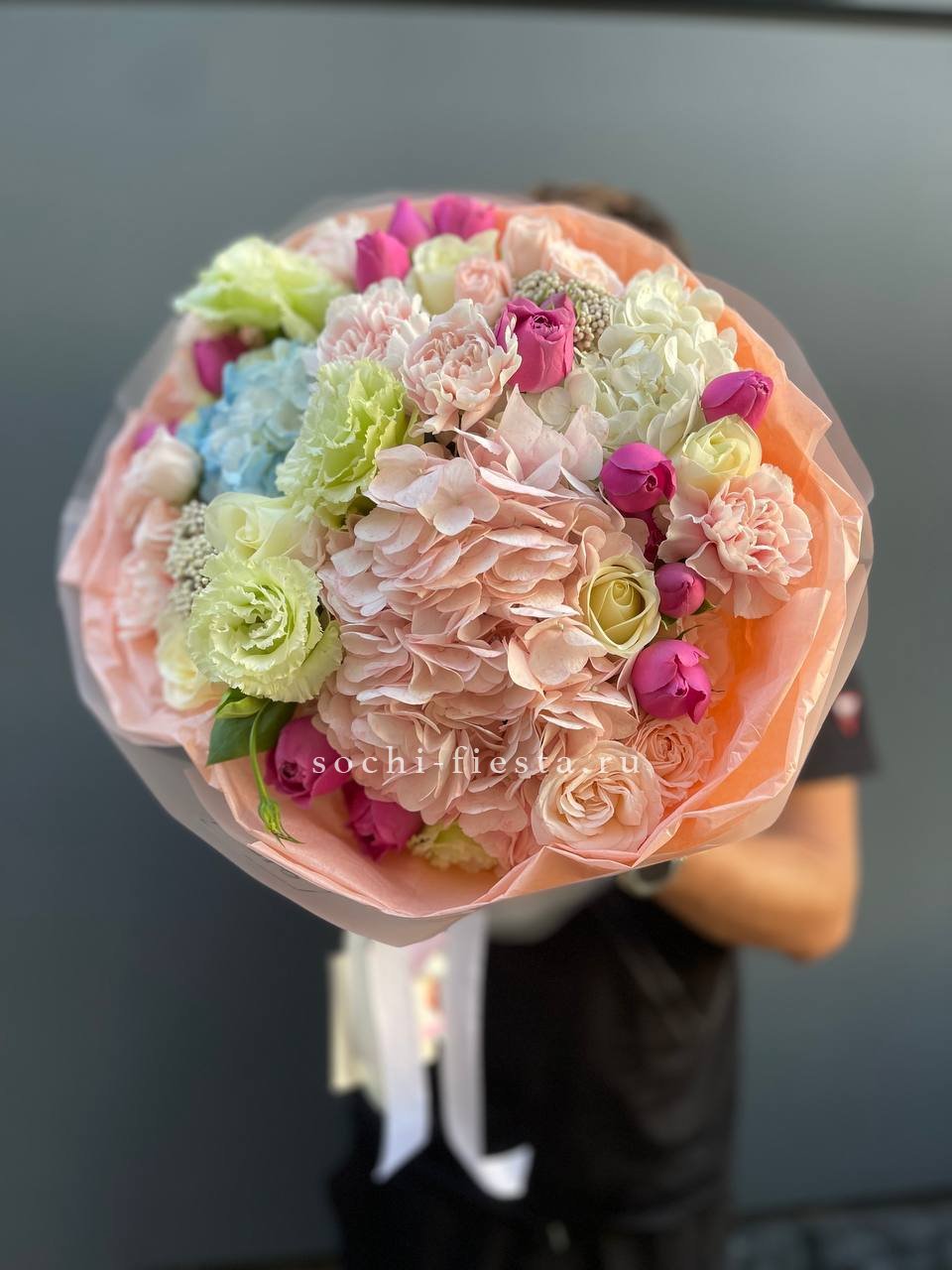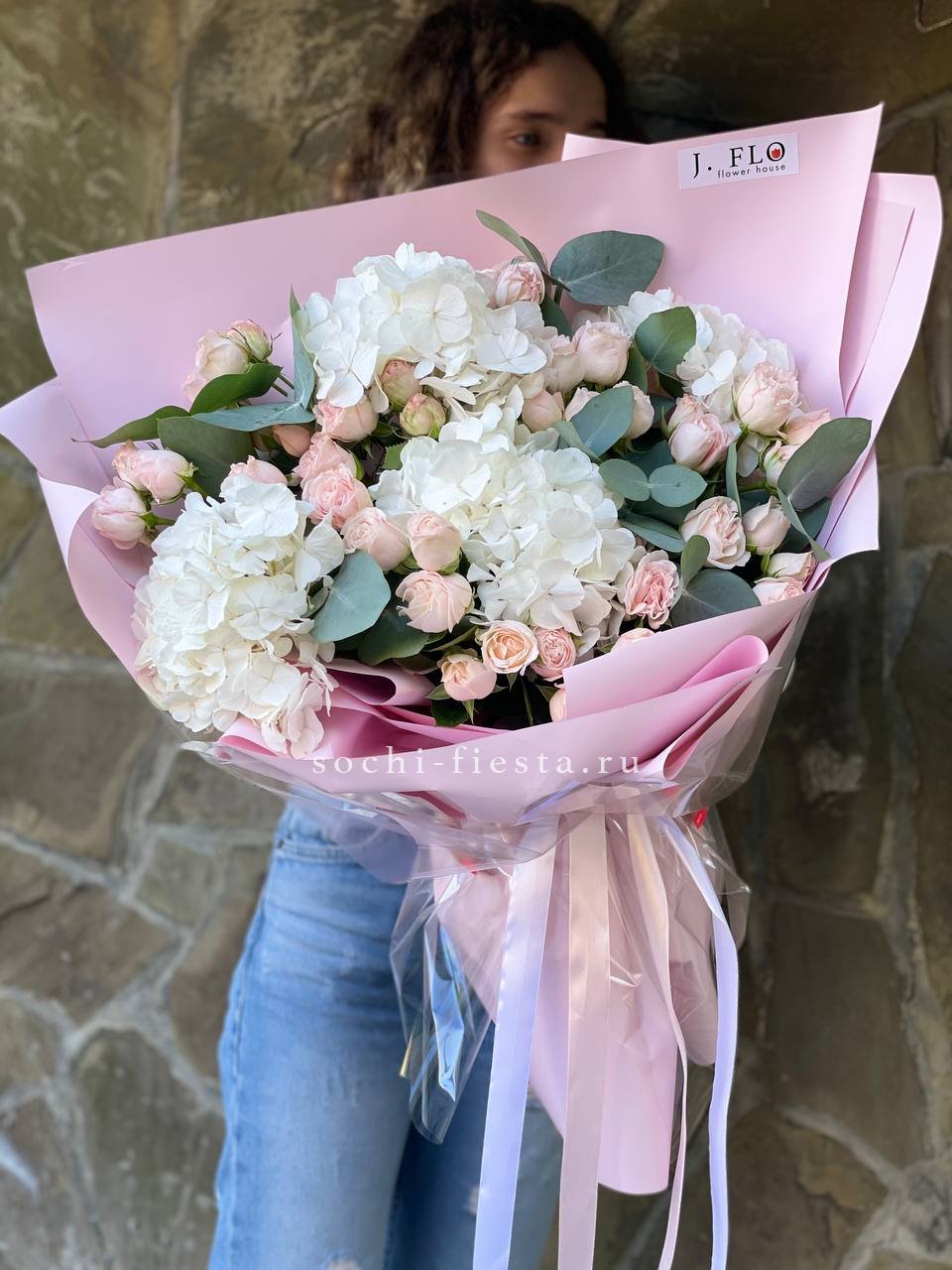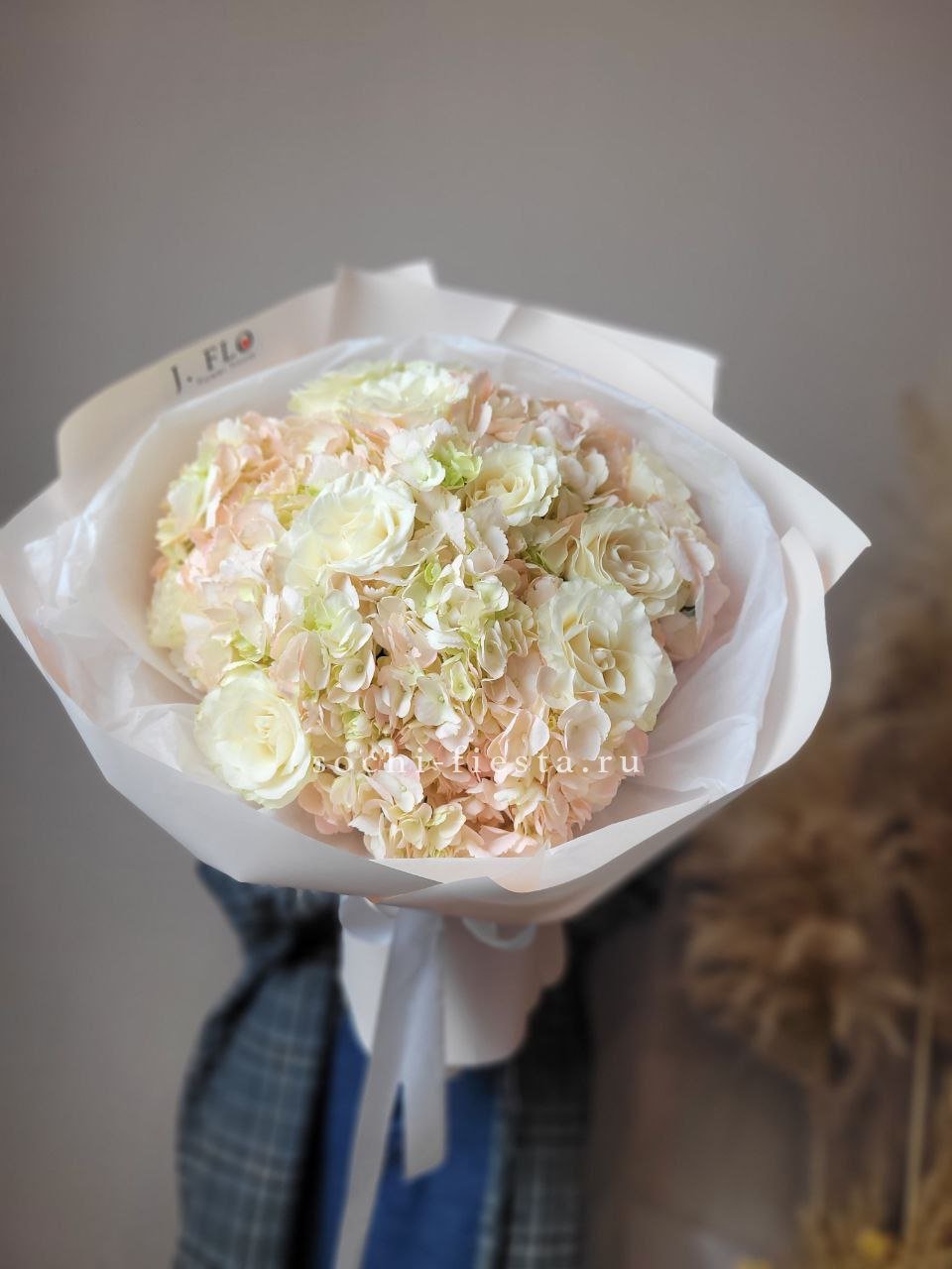 гортензия, эустома, диантус, мисти баблс, озотамус в нежном оформлении.