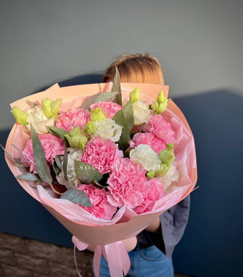 Воздушные соцветия кустовой хризантемы чередуются с яркими головками диантусов. Эвкалипт обрамляет букет серебристой зеленью, создавая лёгкое и свободное настроение.
