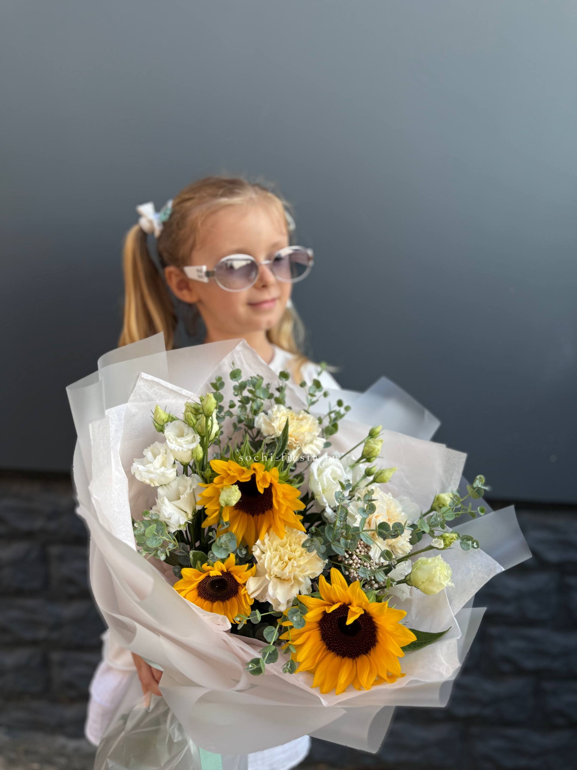 Подсолнухи долго сохраняют форму, диантусы и эустома добавляют стойкости. Озатамус и эвкалипт держат структуру букета и не требуют частой замены воды. Практичное решение для дома.