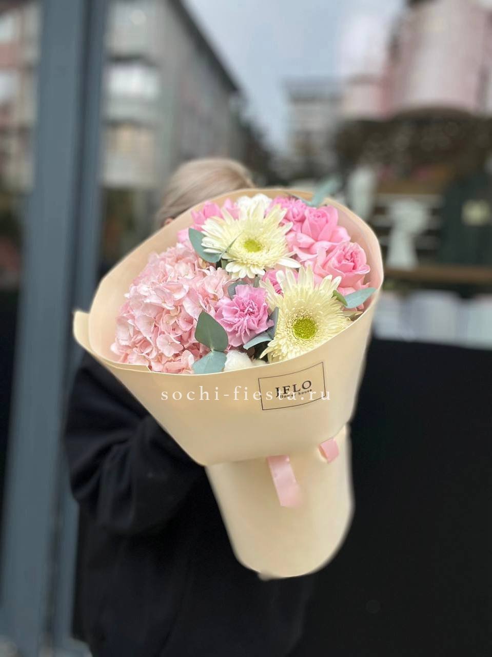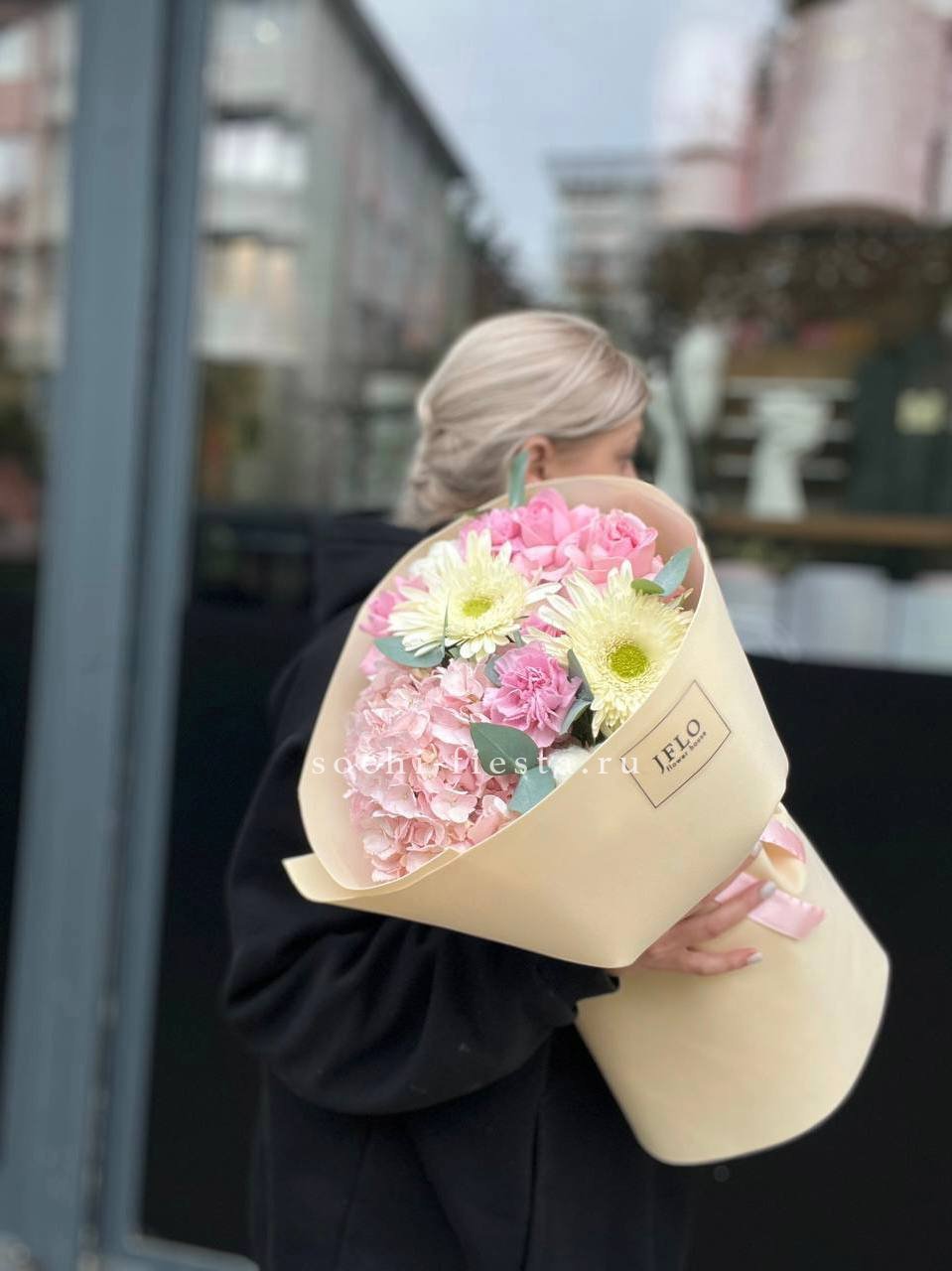 гортензия, белая роза, диантус, хризантема, эустома, озатамус, пленка.
