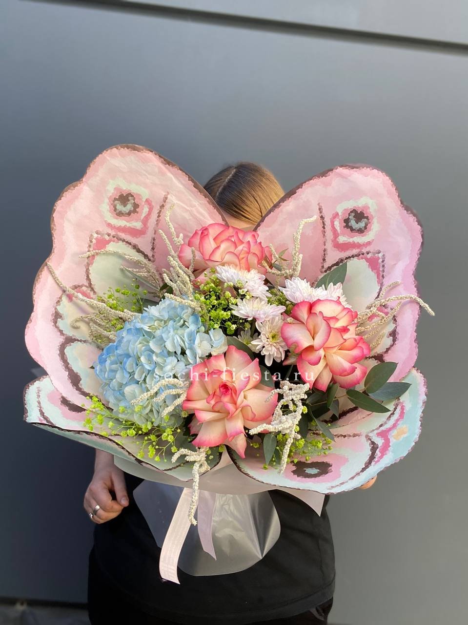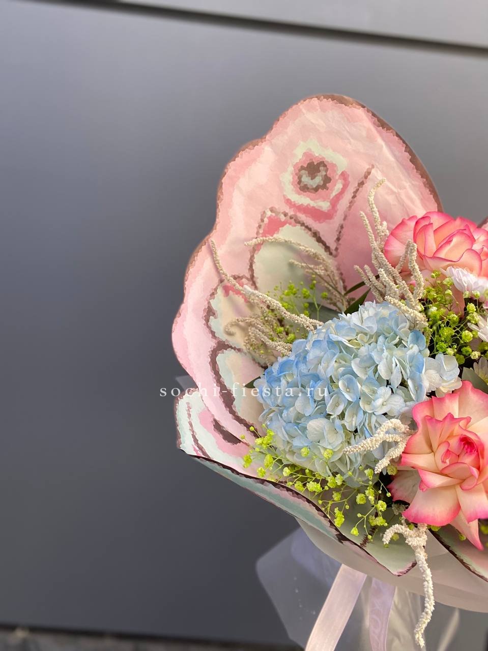 гортензии, хризантемы, лента и дизайнерская пленка.