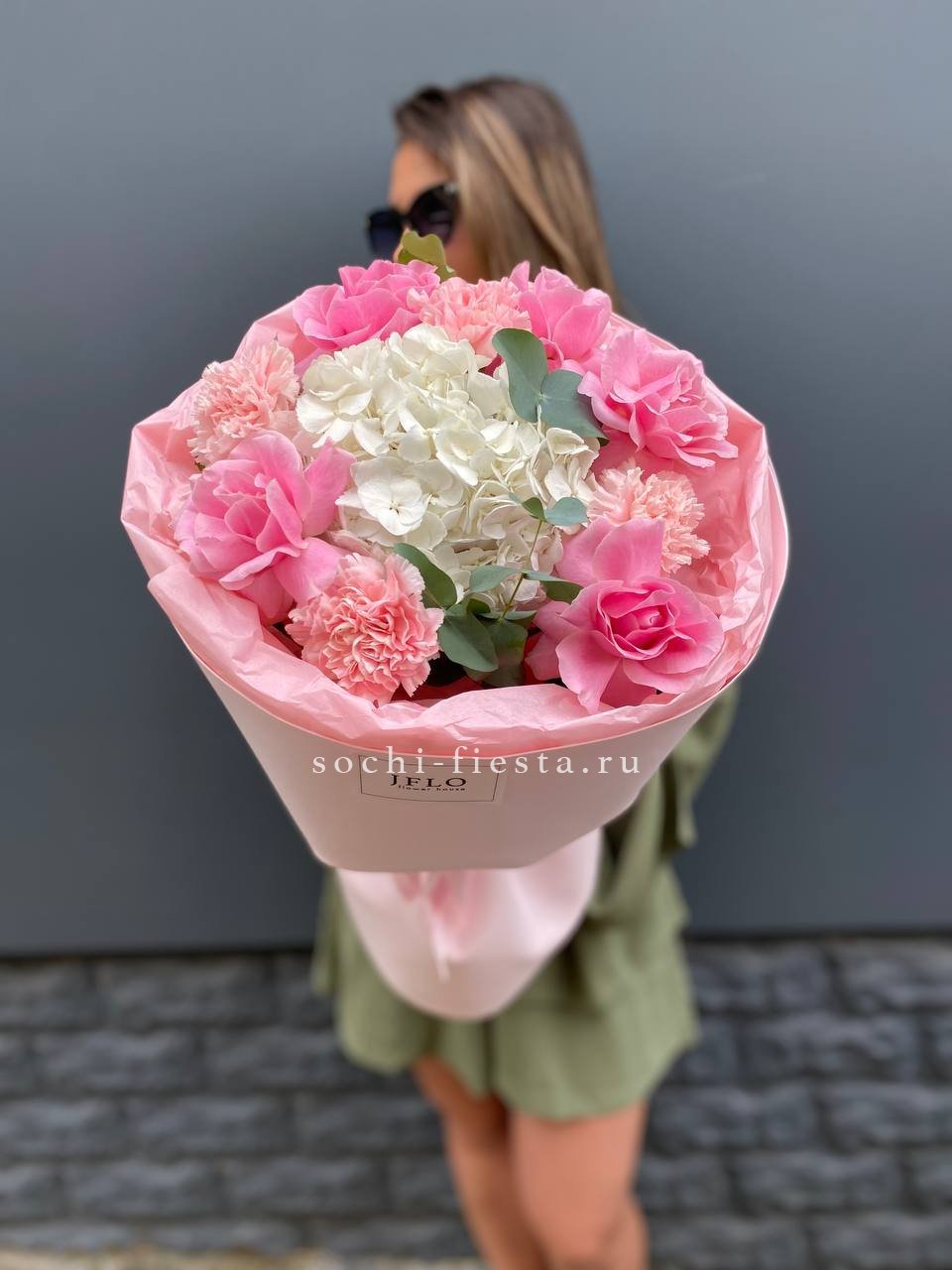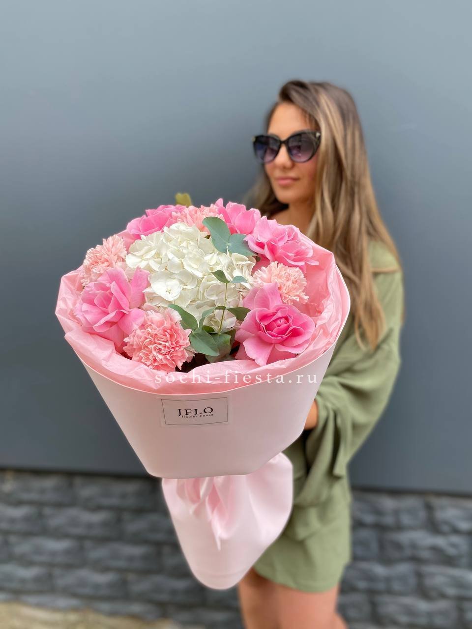 хризантема кустовая, гортензия, мисти баблс, розы в нежном оформлении.