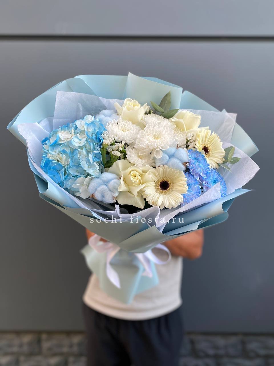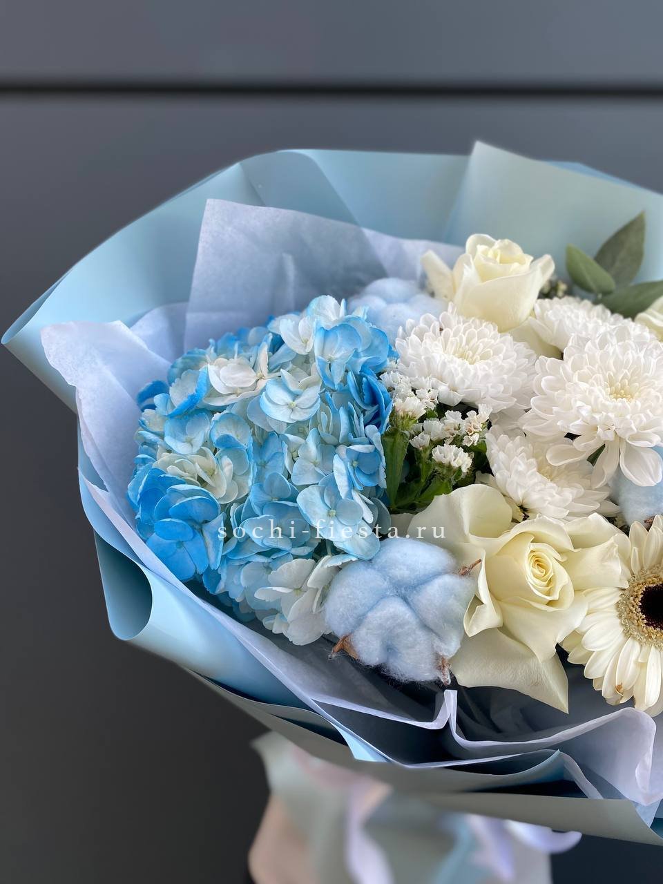 Гортензия образует пышную основу, сквозь которую проступают светлые головки эустомы и роз. Бомбастик вносит графичность, создавая объём и глубину.