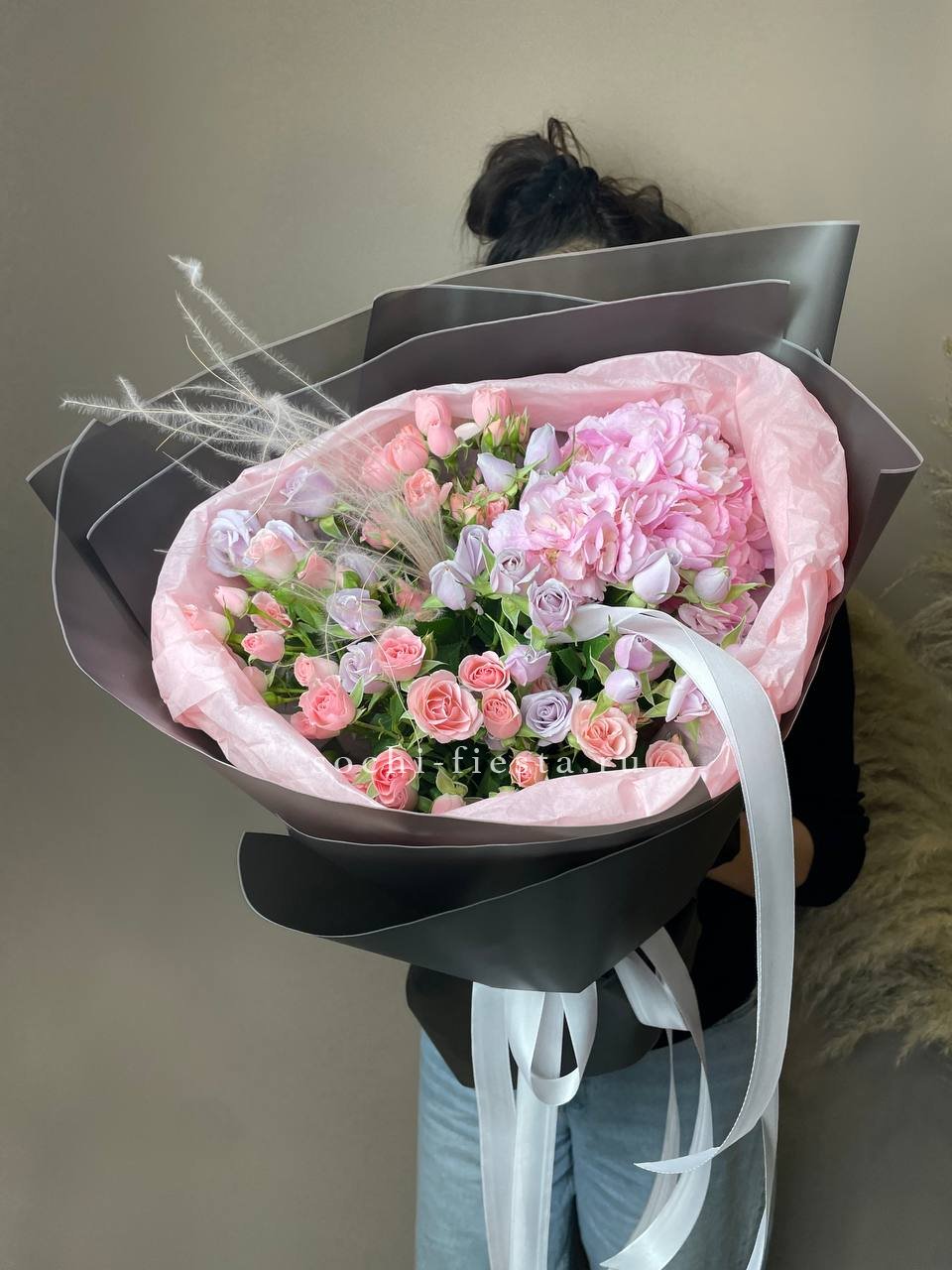 Воздушная композиция в пастельных тонах с пионовидными розами и гортензией создает объемную форму. Каждый бутон раскрывается слоями, а диантусы добавляют графичные точки среди крупных соцветий.