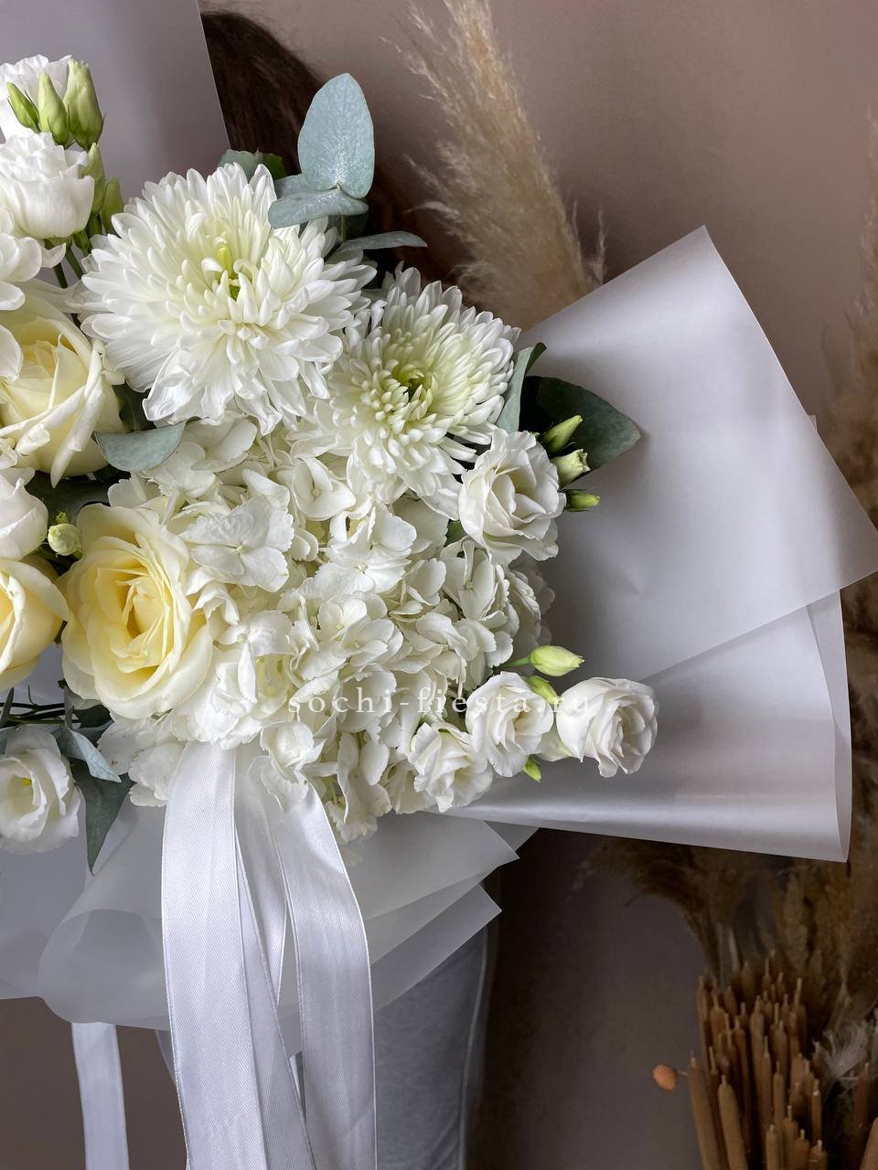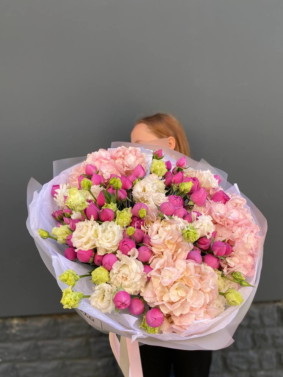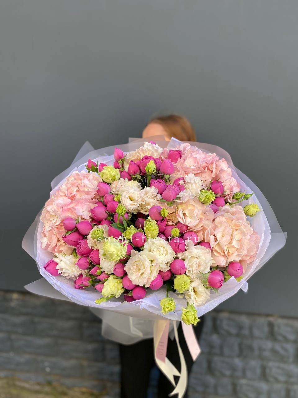 гортензия, роза, кустовая роза, диантус, эустома, дельфиниум, эвкалипт, лента, авторская упаковка.
