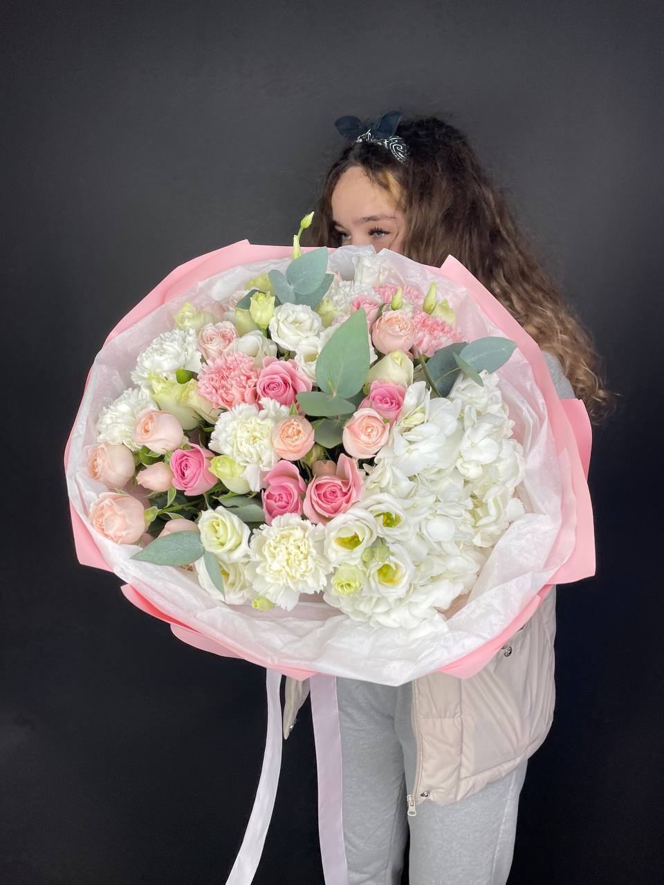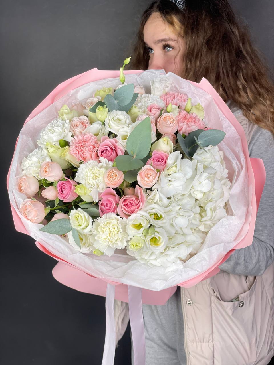 пионовидные розы, розовые пионы, диантусы, эвкалипт, лента, дизайнерская упаковка.