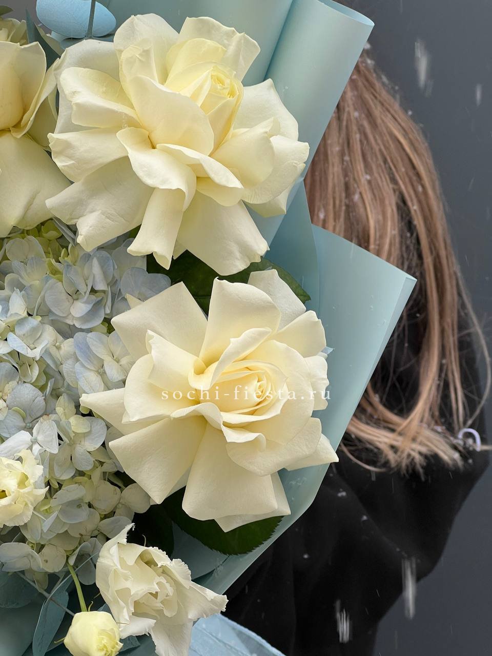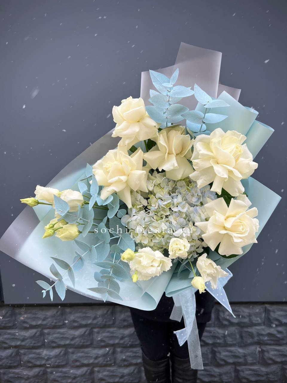 гортензия, пионы, кустовые пионовидные розы, одноголовые розы, дельфиниум (или аналог вне сезона), лента, дизайнерская упаковка.