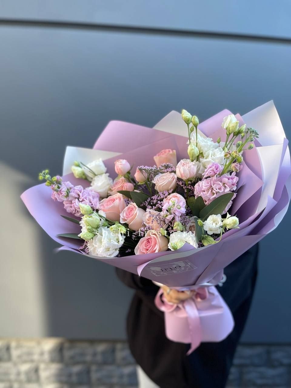 Мягкие пионовидные формы переплетаются с классическими розовыми бутонами в плотной округлой композиции. Эвкалипт освежает палитру и придаёт букету завершённость.