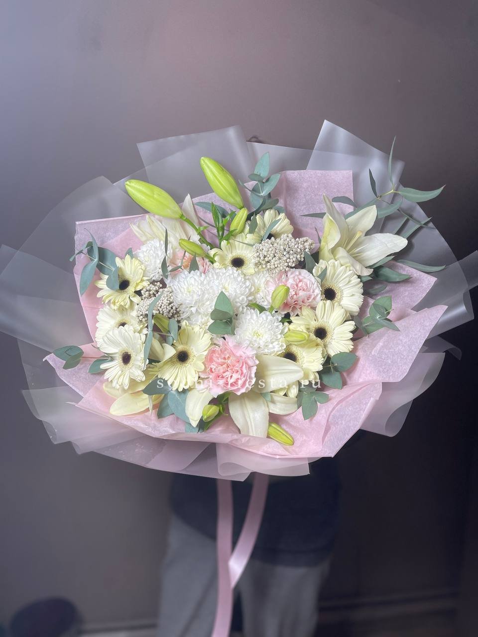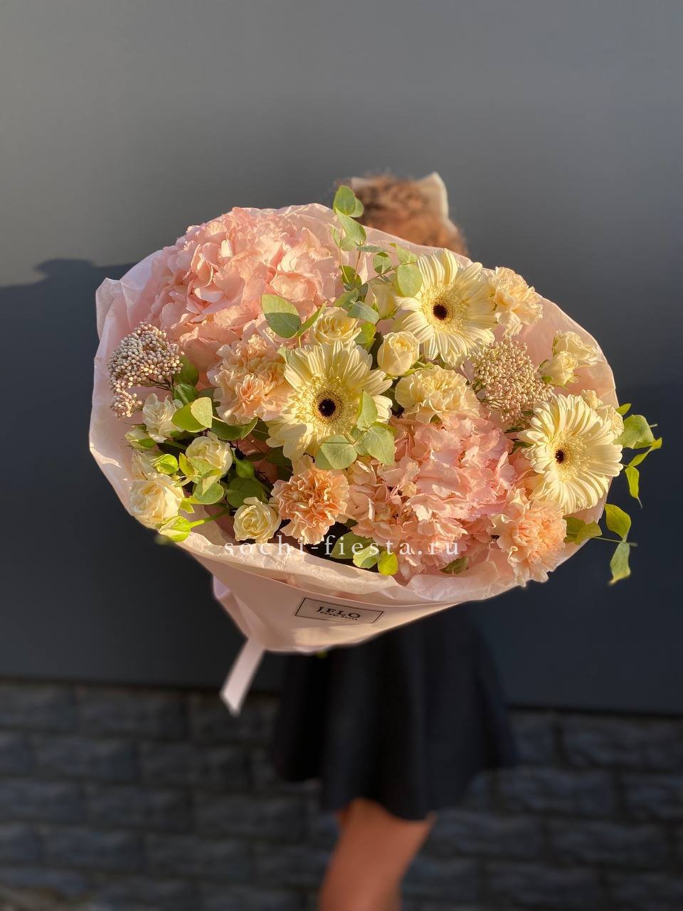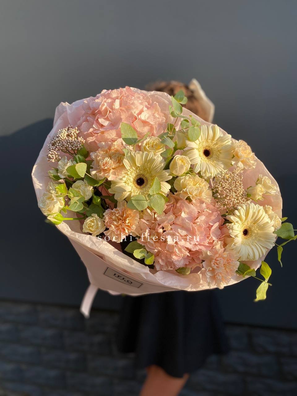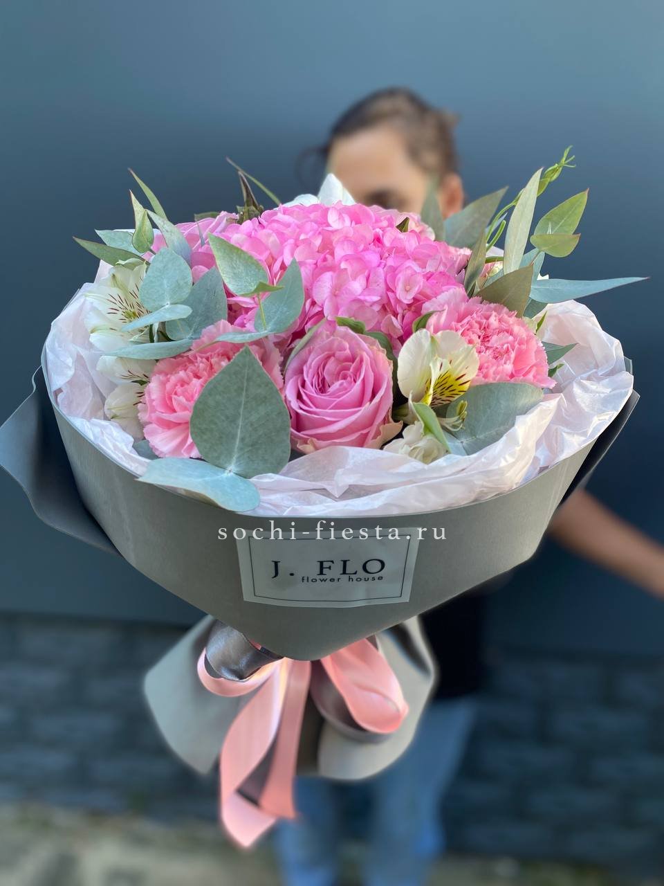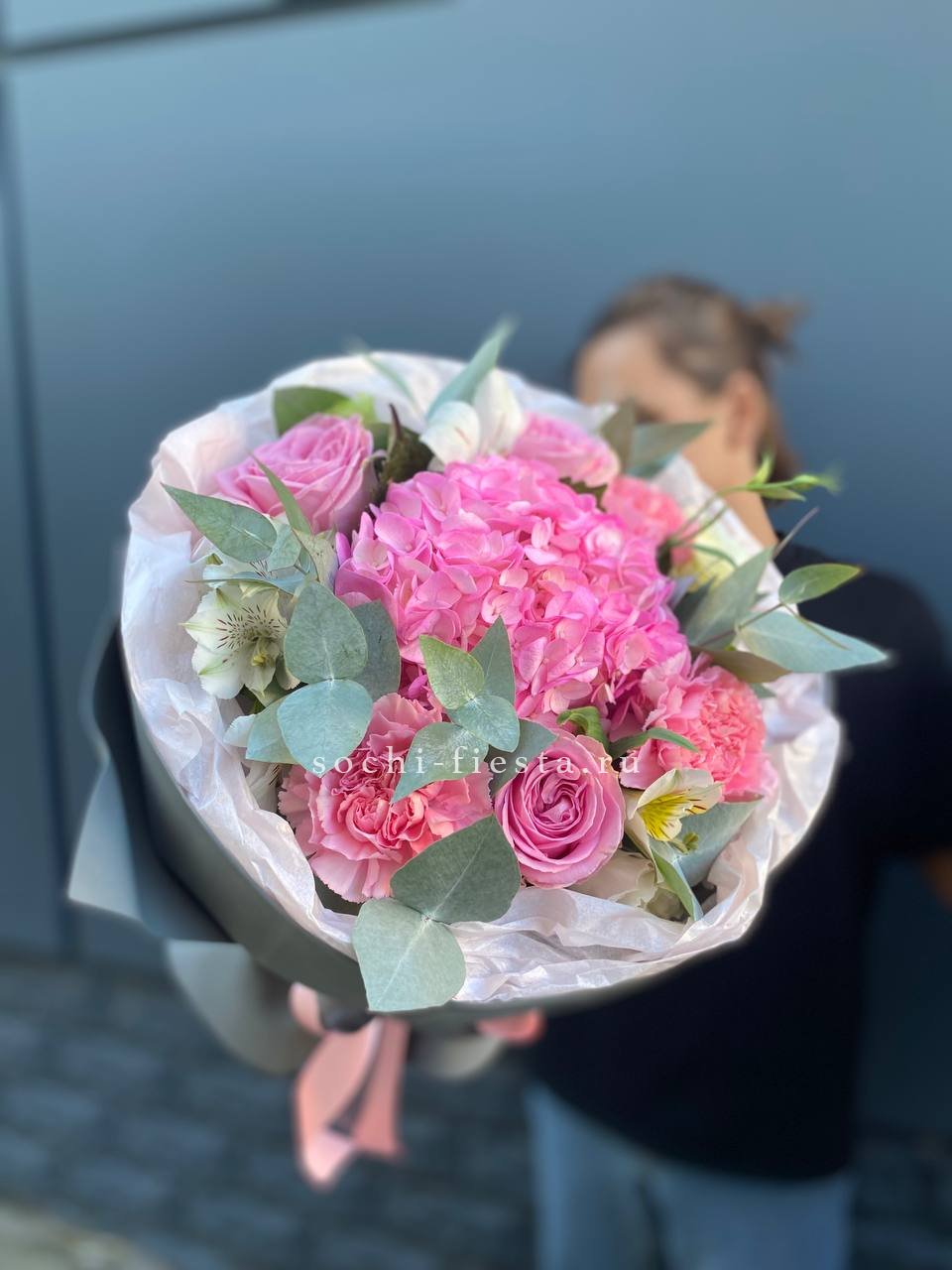 Диантусы и маттиола добавляют букету душистую лёгкость, а гортензия создаёт объёмную основу. Мисти баблс и эвкалипт рисуют воздушный контур вокруг розовых оттенков.