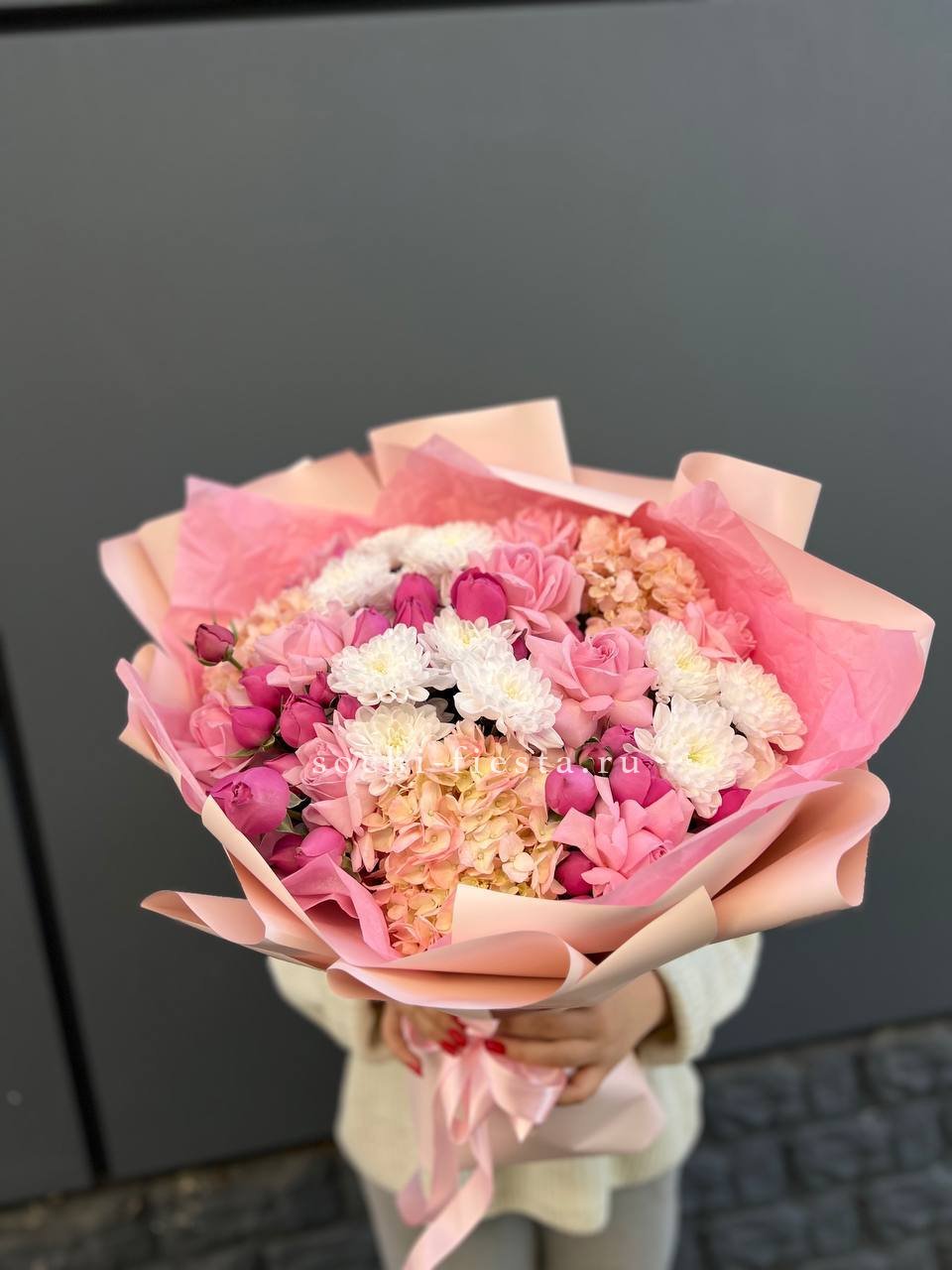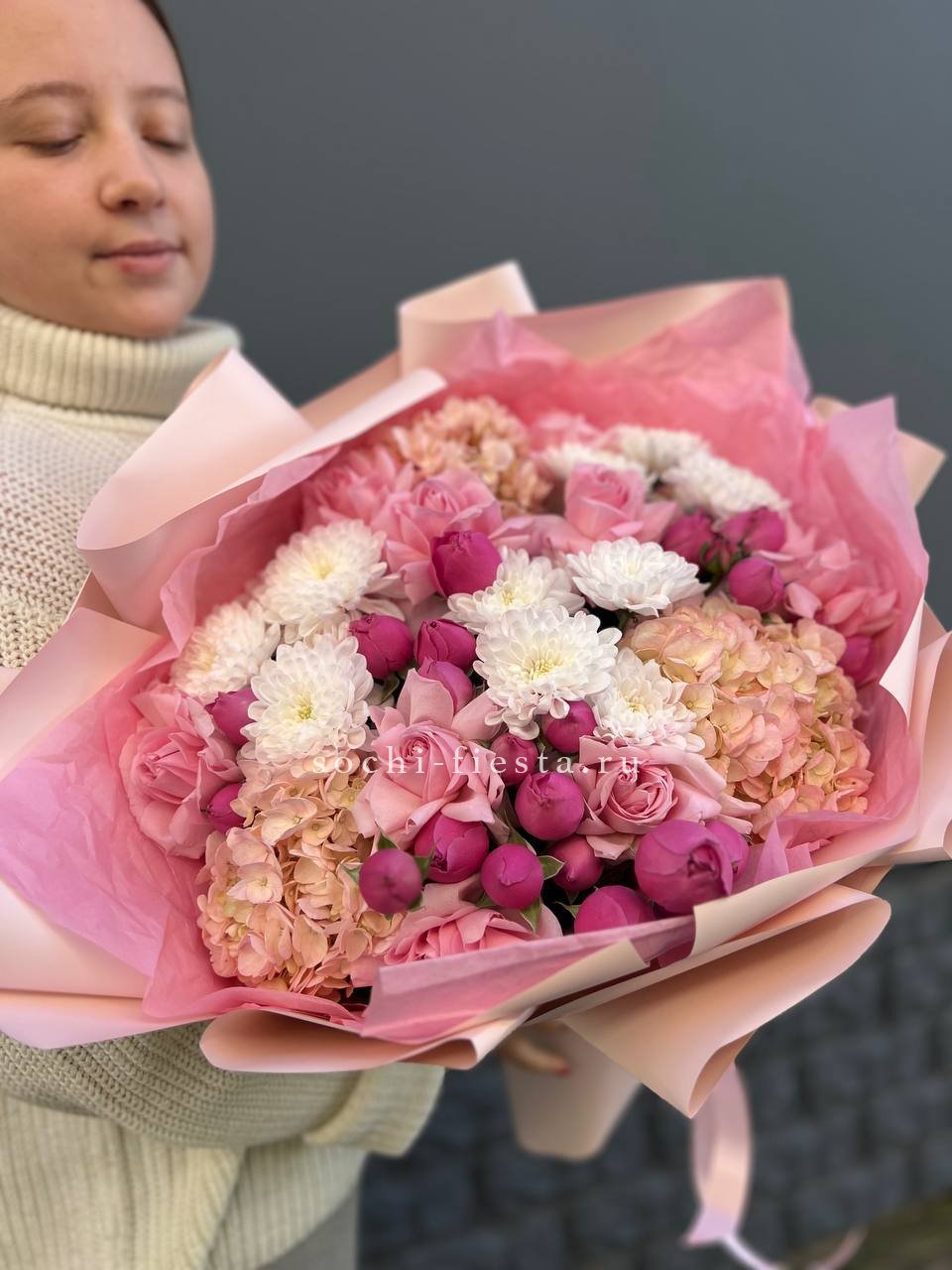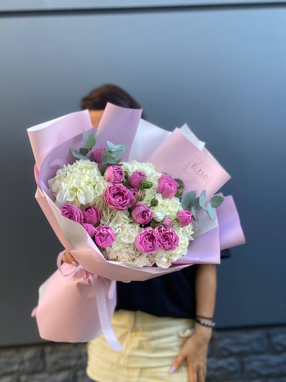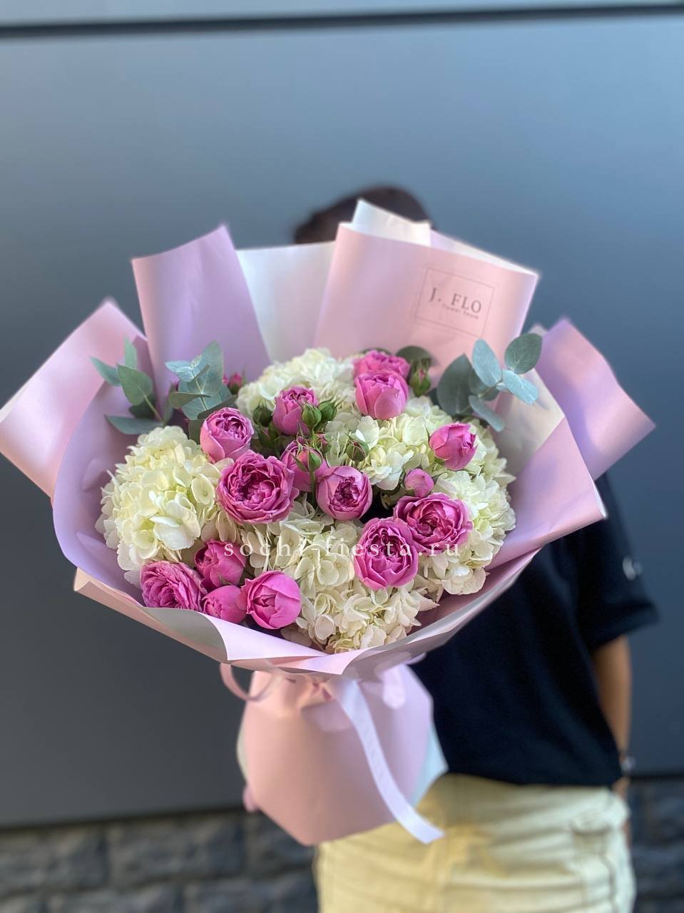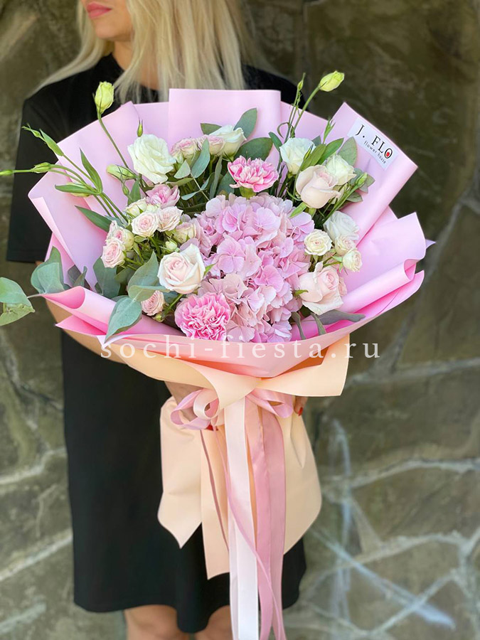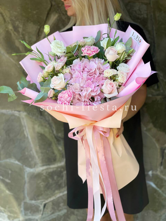 гортензия, диантус, кустовая пионовидная роза, эустома, вспомогательные цветы, эвкалипт, лента, дизайнерская упаковка.