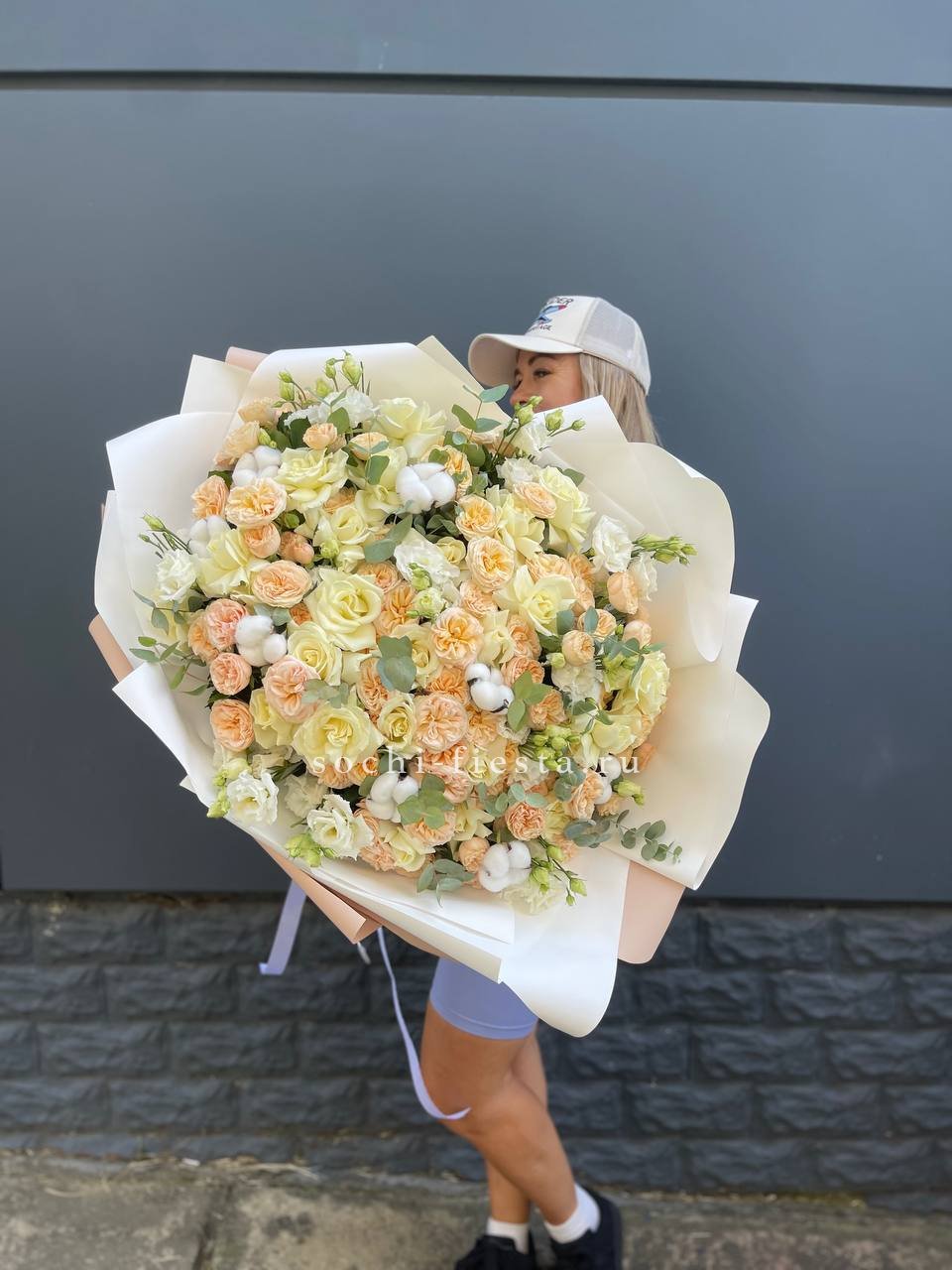 Белоснежная палитра с эустомой и пионовидными розами дополнена натуральным хлопком и эвкалиптом. Крупная композиция с выразительным присутствием и продуманной архитектурой. Форма держится долго благодаря плотности сборки.