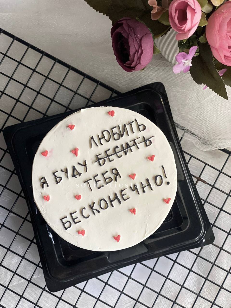 Юмор в съедобной форме — это когда крем уложен ровно, а надпись заставляет улыбнуться. Небольшой формат помещается в ладонях и легко становится центром стола. Выбор из двух начинок добавляет интригу.