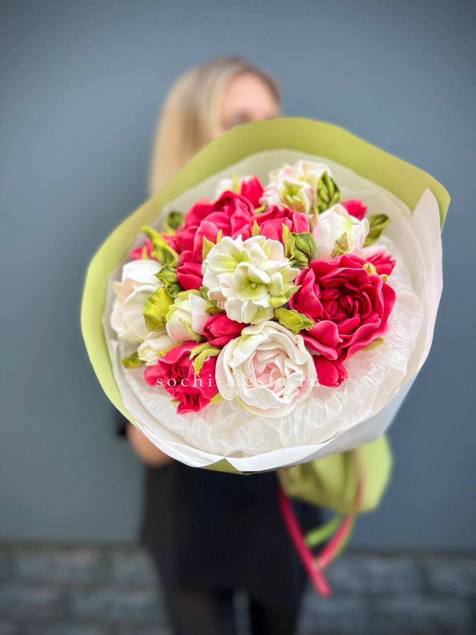 сахар, патока, пектин, агар, яблочное пюре, яичный белок, натуральный краситель, лимонная кислота. Цена за 1букет, размер S.